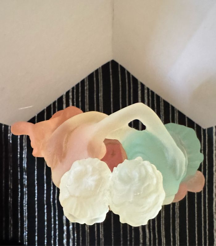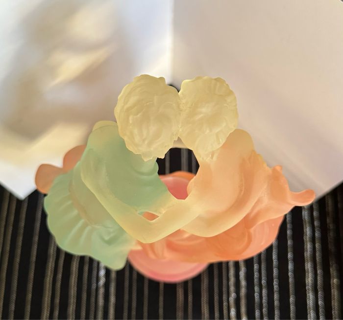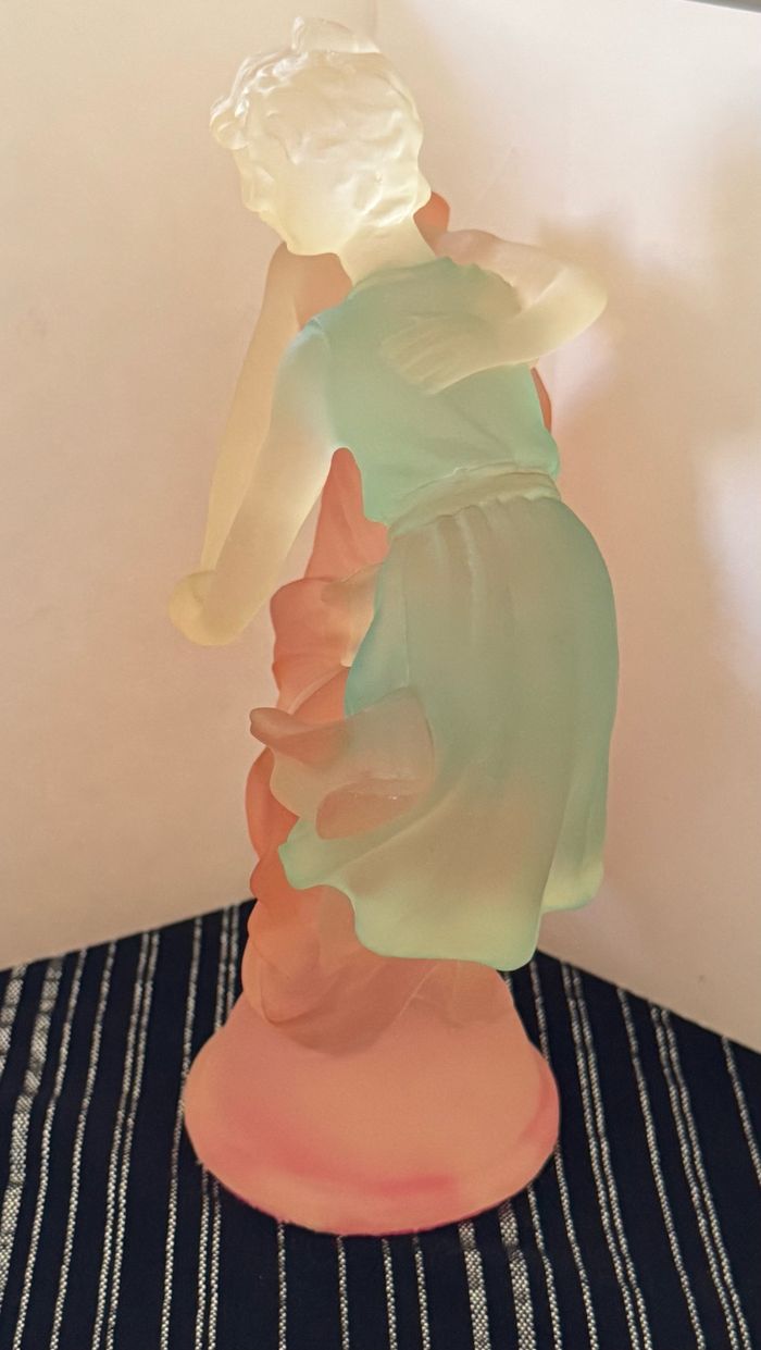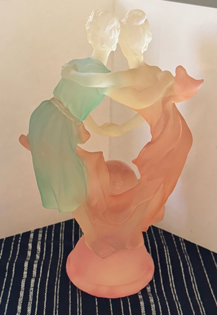 Figurine en verre dépoli femmes danseuses. Couleurs : rose, bleu et blanc. Taille : hauteur 21 cm, largeur 13 cm, 7,5 cm. Base 7,5 cm de diamètre. De la feutrine rose a été ajoutée sur la base (voir dernière photo).