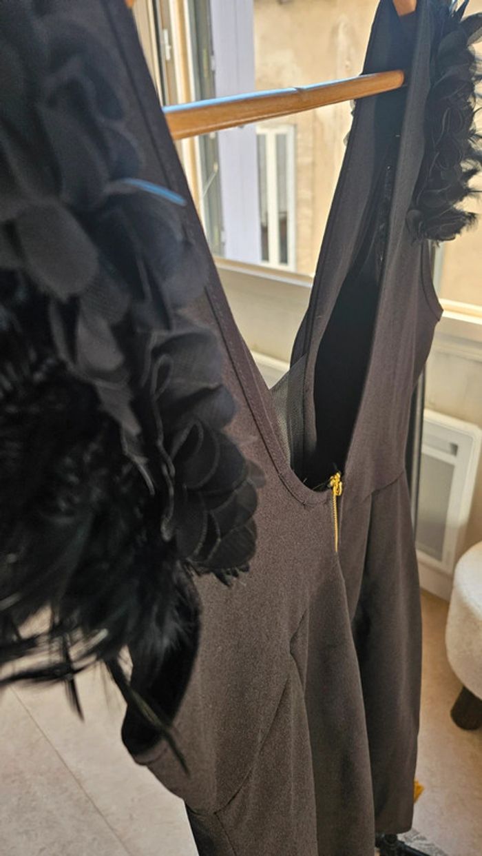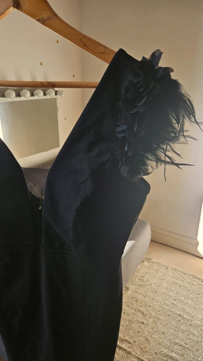 Robe noire décolleté résille et détails plumes sur les manches, dos un peu plongeant