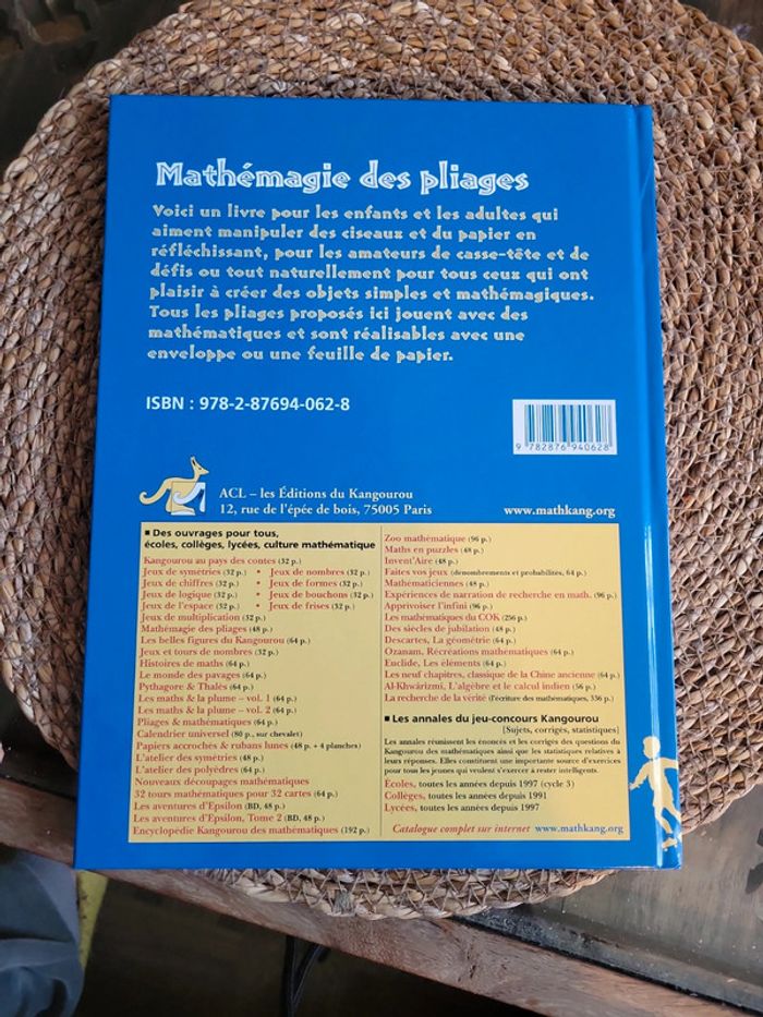 Voici un livre pour les enfants et les adultes qui aiment manipuler des ciseaux et du papier en réfléchissant, pour les amateurs de casse-tête et de défis ou tout naturellement pour tous ceux qui ont plaisir à créer des objets simples et mathémagiques. Tous les pliages proposés ici jouent avec des mathématiques et sont réalisables avec une enveloppe ou une feuille de papier. Neuf. Lot possible, sur demande, avec d autres articles de mon dressing. Envoi rapide et soigneux