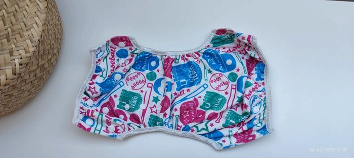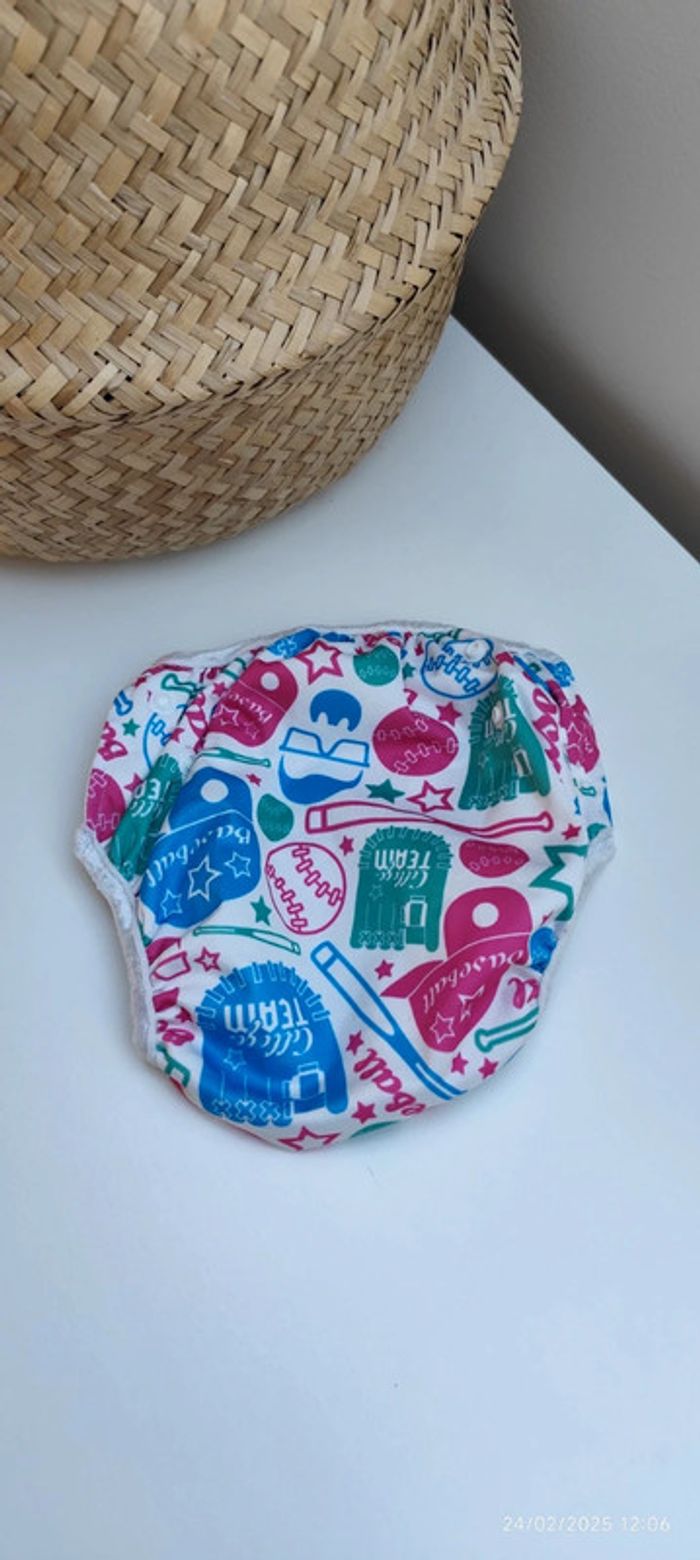 Je vends cette couche de piscine lavable en machine à motif baseball et inscriptions « college team». La couche est extensible ou rétractable de par les pressions, donc elle peut servir sur une longue durée. #Estelle2150_puericulture
