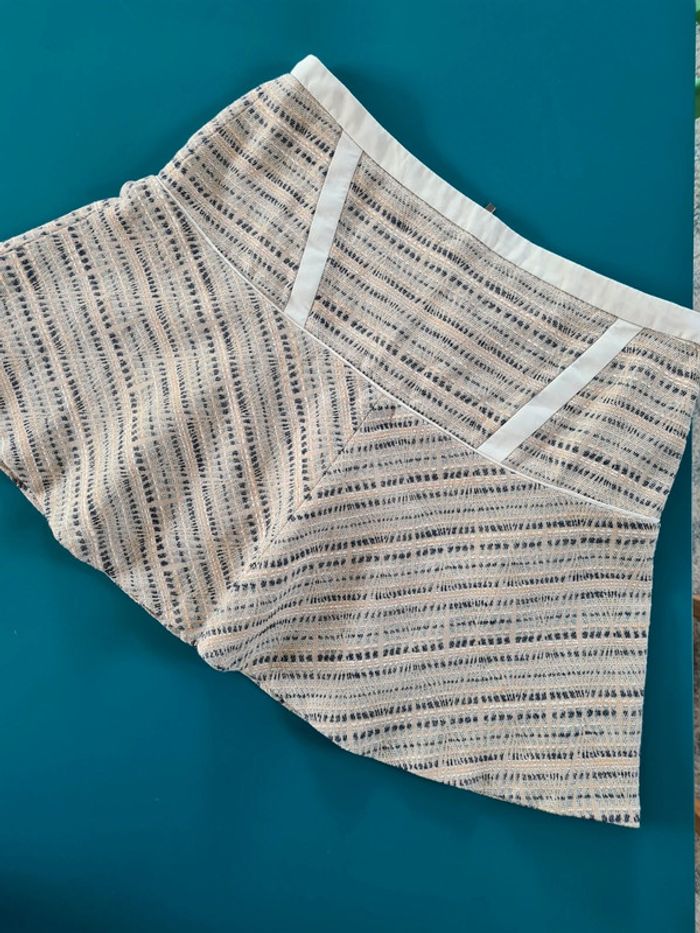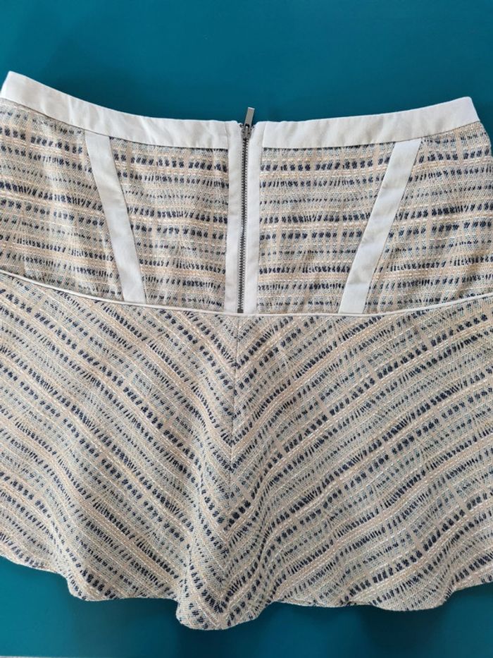 Comme neuve portée 1 fois Très bonne qualité Jupe doublée - détails en fil pailleté doré Fermeture éclair dans le dos Payée 70€ en boutique Taille 40 - taille normalement Hauteur de la taille au bas de la jupe 42 cm Jupe plutôt courte si vous êtes grande