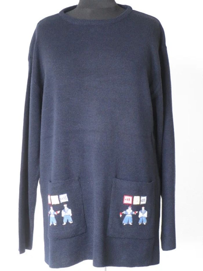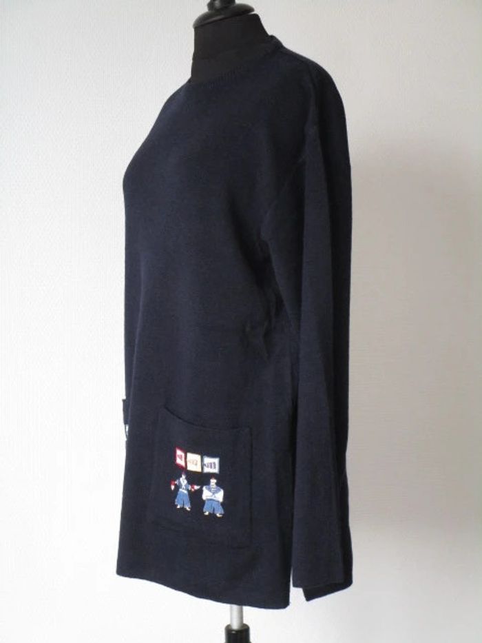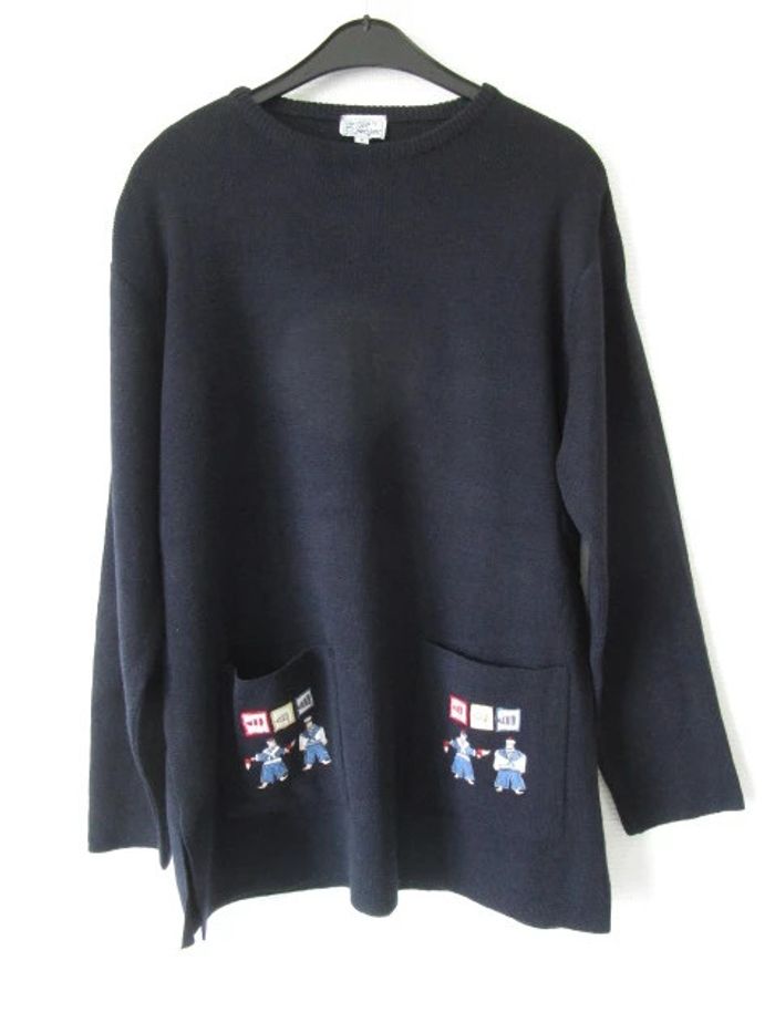 Pull bleu marine vintage Taille 2, correspond à du 46 (cf mesures) Col rond 2 petites poches sur le devant avec broderies petits marins et drapeaux 52% acrylique/48% coton Largeur carrure : 51 cm Largeur aisselle à aisselle : 58 cm Longueur : 72 cm Etat impeccable #mamanbrade59femme46