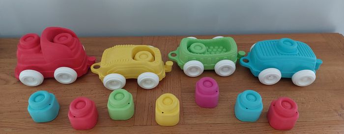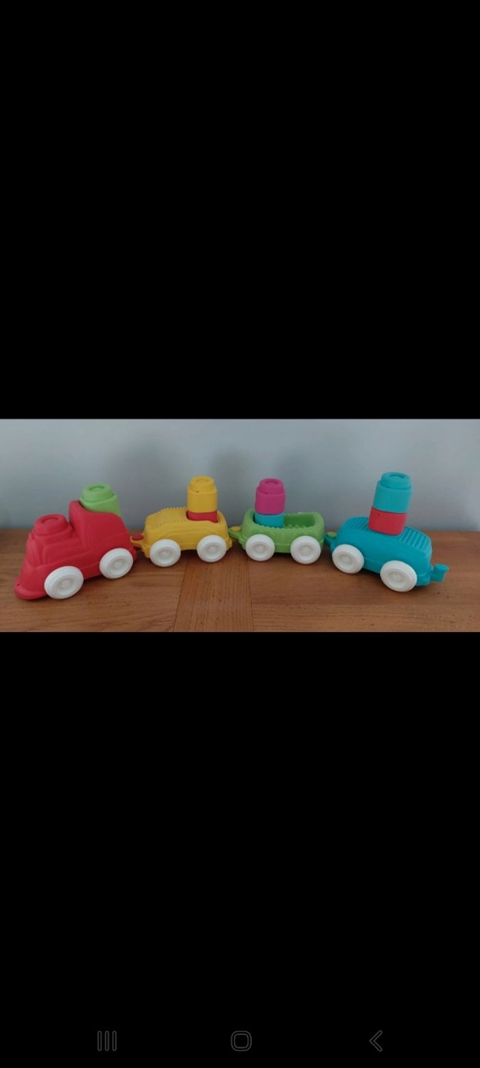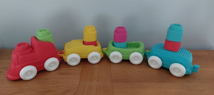 Train clemmy clementoni Complet : 1 locomotive + 3 wagons + 7 cubes Très bon état Cubes mous souples Bébé dès 6 mois