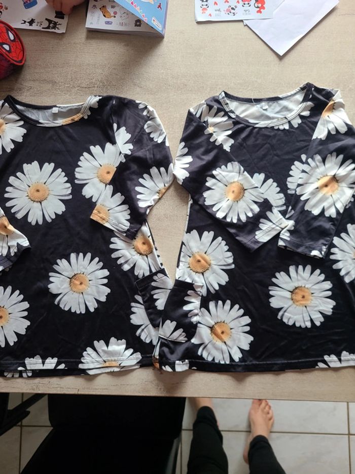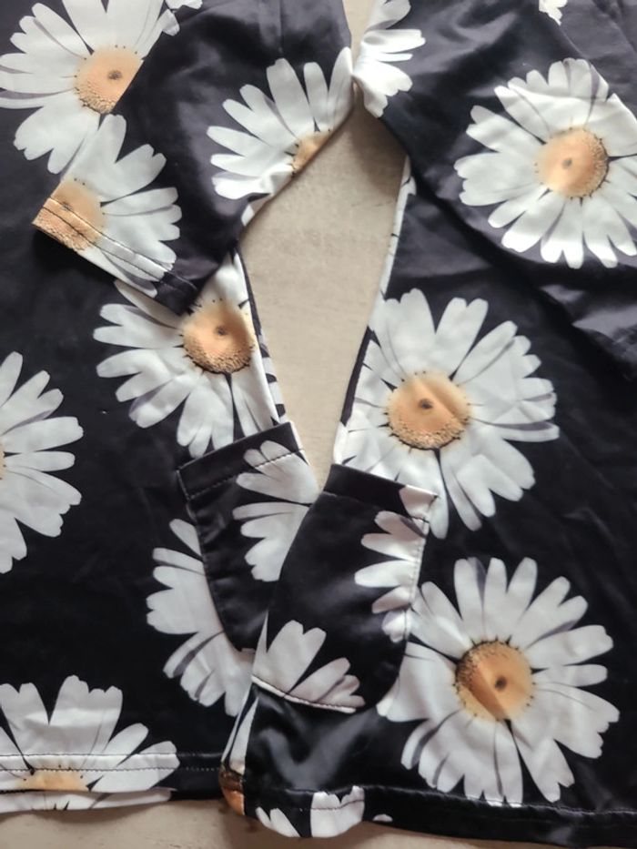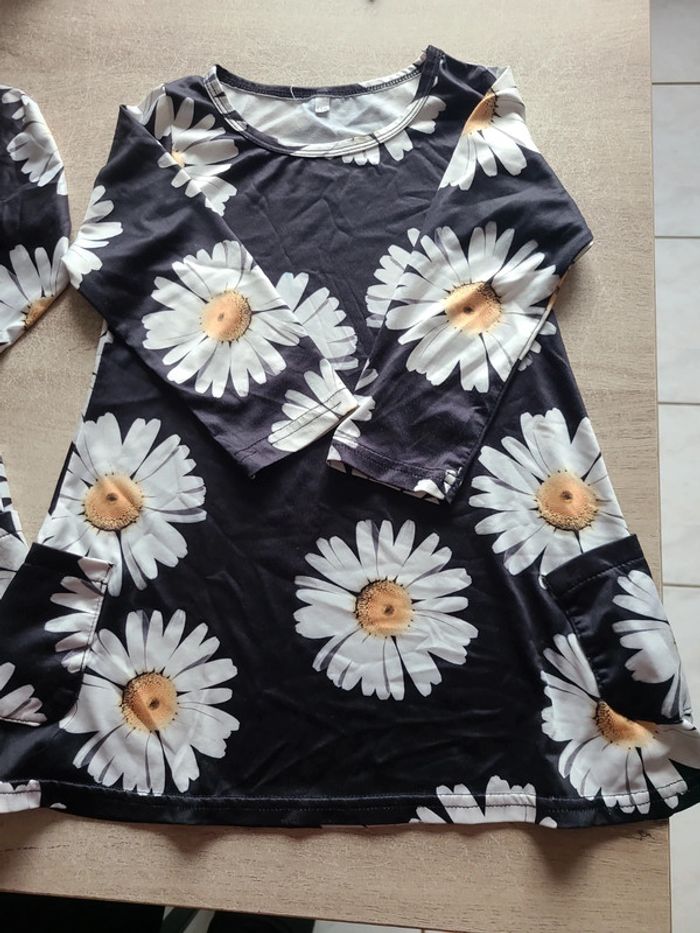 Lot de 2 robes noires avec motifs Marguerite et manches longues. Poches latérales, tissu léger. Idéales pour une soirée ou un après-midi de mi saison. Une trace de feutre bleu sur l'une des manches, je l'ai acheté comme ça sur Vinted, cela ne m'a pas gêné. Elles sont toutefois en très bon état.