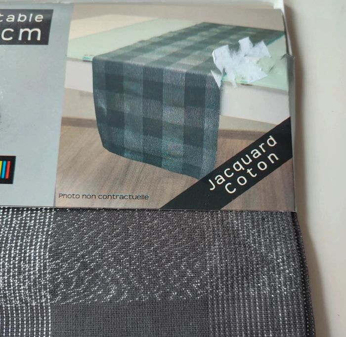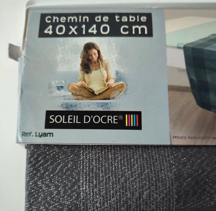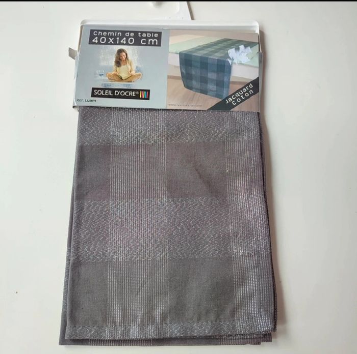 Chemin de table en coton avec des fils argentés 📏 40 x 140 cm, de la marque Soleil d'Ocre 🧶 95 %coton , 5% lurex Il est neuf dans son emballage d'origine Idéal pour rajouter sur une jolie nappe