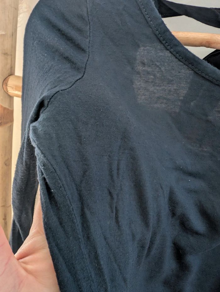 Top manches 3/4 bleu marine avec noeud haut du dos noir. Marque Naf Naf. Taille S. État satisfaisant déjà porté avec petites bouloches d'usure visibles en photos. #tennytebvetementsfemme #nafnaf