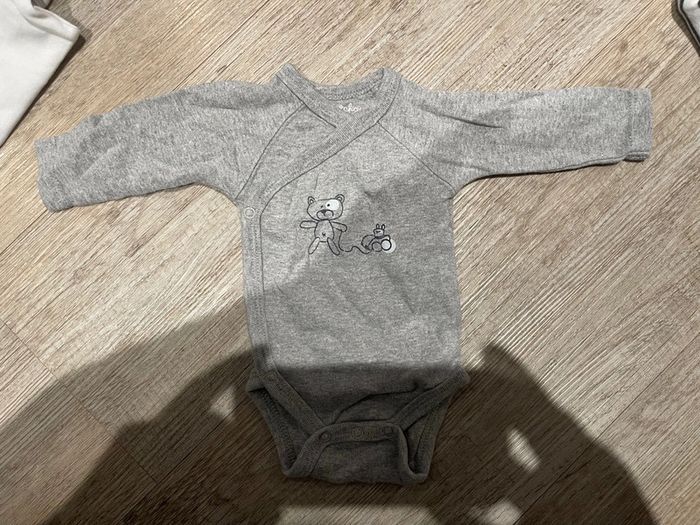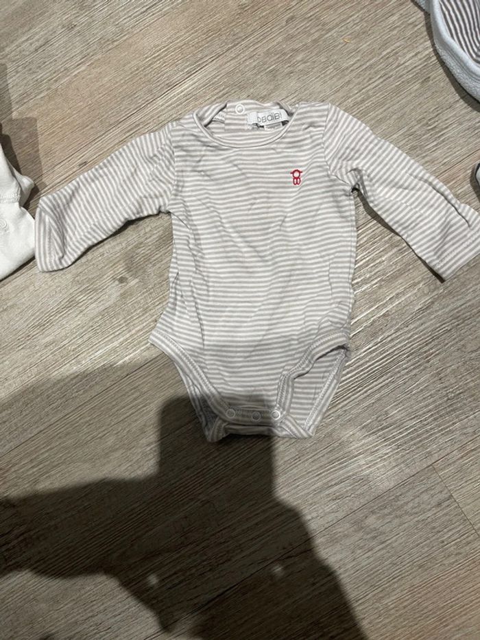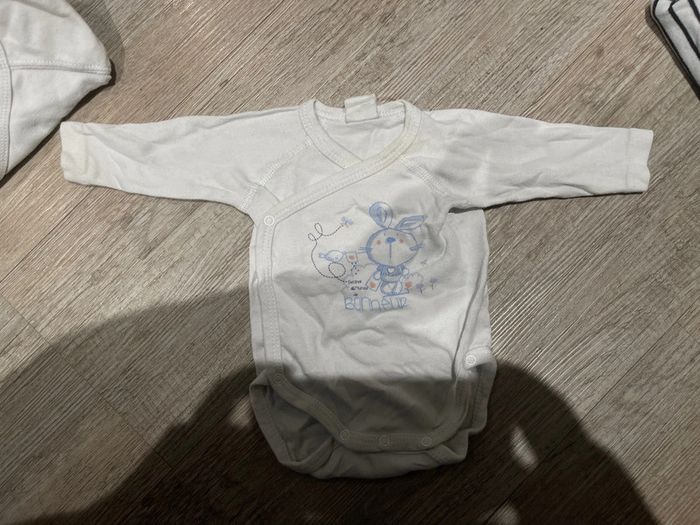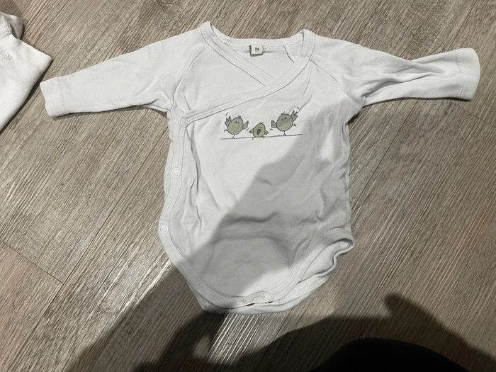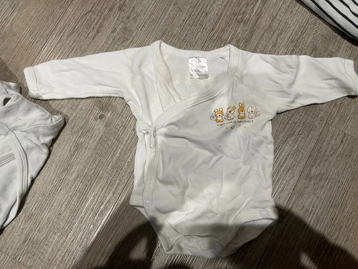 Bodies 1 mois plusieurs marques Obaïbi Verbaudet Kitchoun Ect Seulement le 1 er a une tache à l’encolure Possible de vendre en lot ou à l’unité 1€ par bodies en lot+ le tacher à 0,50= 10,5€le lot Ou 1,50€ le bodies à l’unité