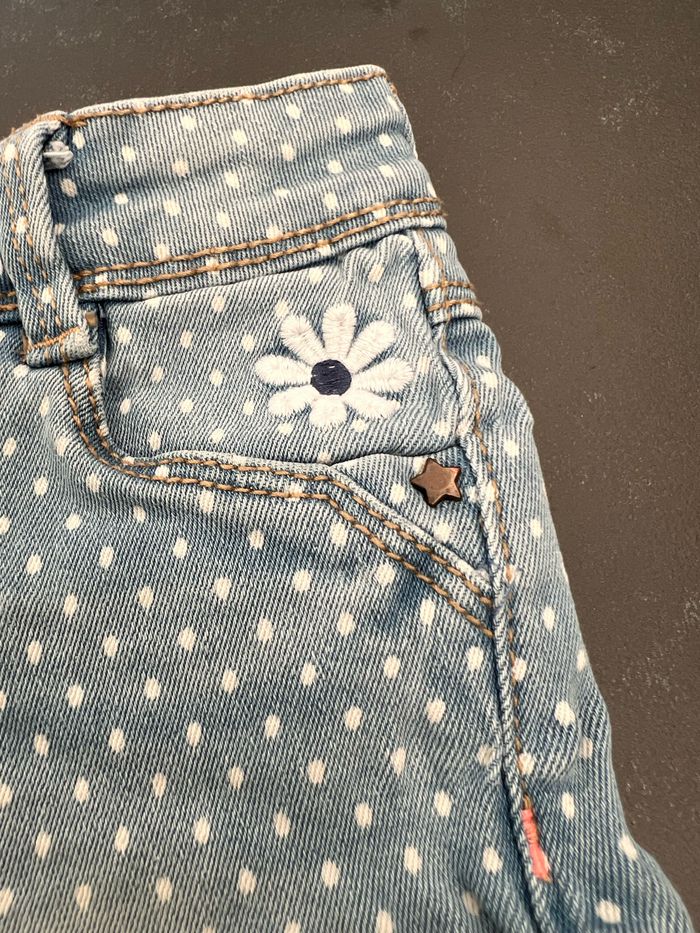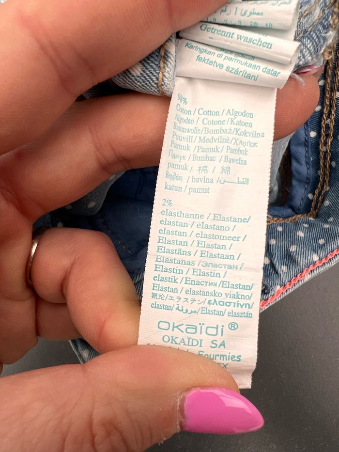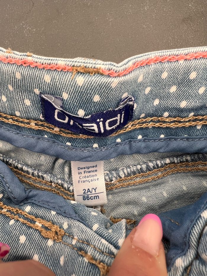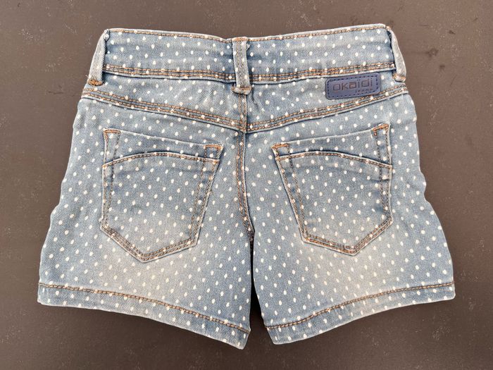 Short en jean de couleur bleu clair à points blancs. 4 poches, fermeture par bouton pression, fermeture éclair, élastique de serrage à l’intérieur. En excellent état, aucune tâche ni trou. En coton et elasthanne. Taille 2 ans, marque Okaidi. Envoi rapide et soigné, réduction automatique dès 2 articles sélectionnés. Mes autres ventes ici: #24moisfilleugolola #24moisfille #2ansfille #shortjeanfille #shortjean2ansfille
