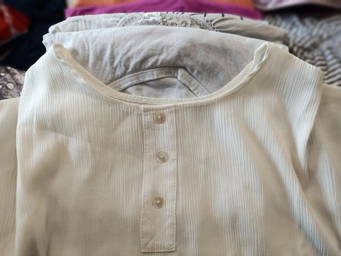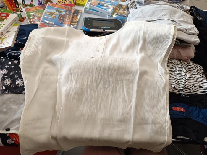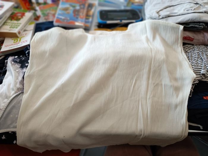 Vends t shirt blanc cassé en crêpe manches courtes. Taille XL Prix : 3€