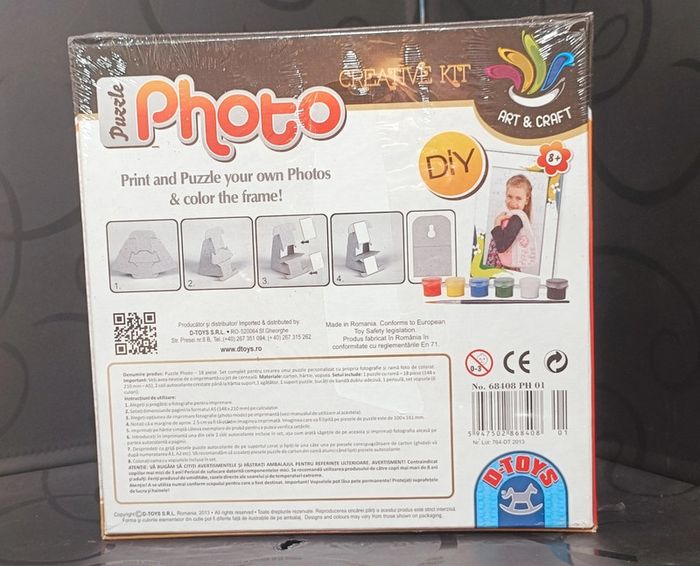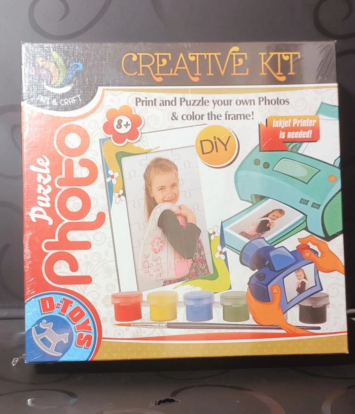 Puzzle - Photo -18 pieces. Ensemble complet pour créer un puzzle personnalise avec votre propre photo a colorier. Important : vous avez besoin d'une imprimante jet d'encre. Matériaux: carton, papier, peinture ,l'ensemble comprend : 1 puzzle avec cadre de 18 pièces avec 2 feuilles cadre (148×220mm - A5) de autocollants crantés sur le papier support, 1 cintre, 1 support puzzle, des morceaux de scotch double face, un set de peinture. le jeu est neuf dans son emballage d'origine marque DToys Je vends beaucoup d' autres articles. N'hésitez pas à vous abonner et aller regarder mes autres annonces possibilité de faire des lots sympas et envoie rapide 🙂.