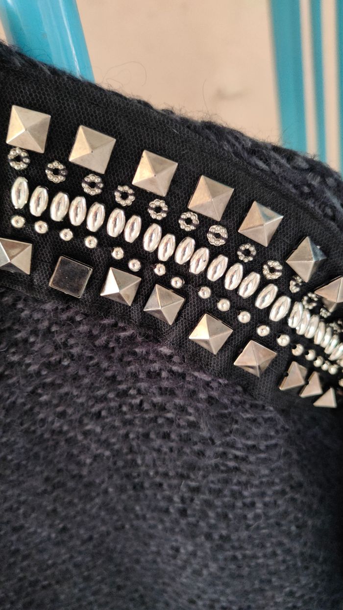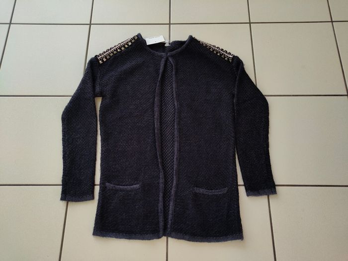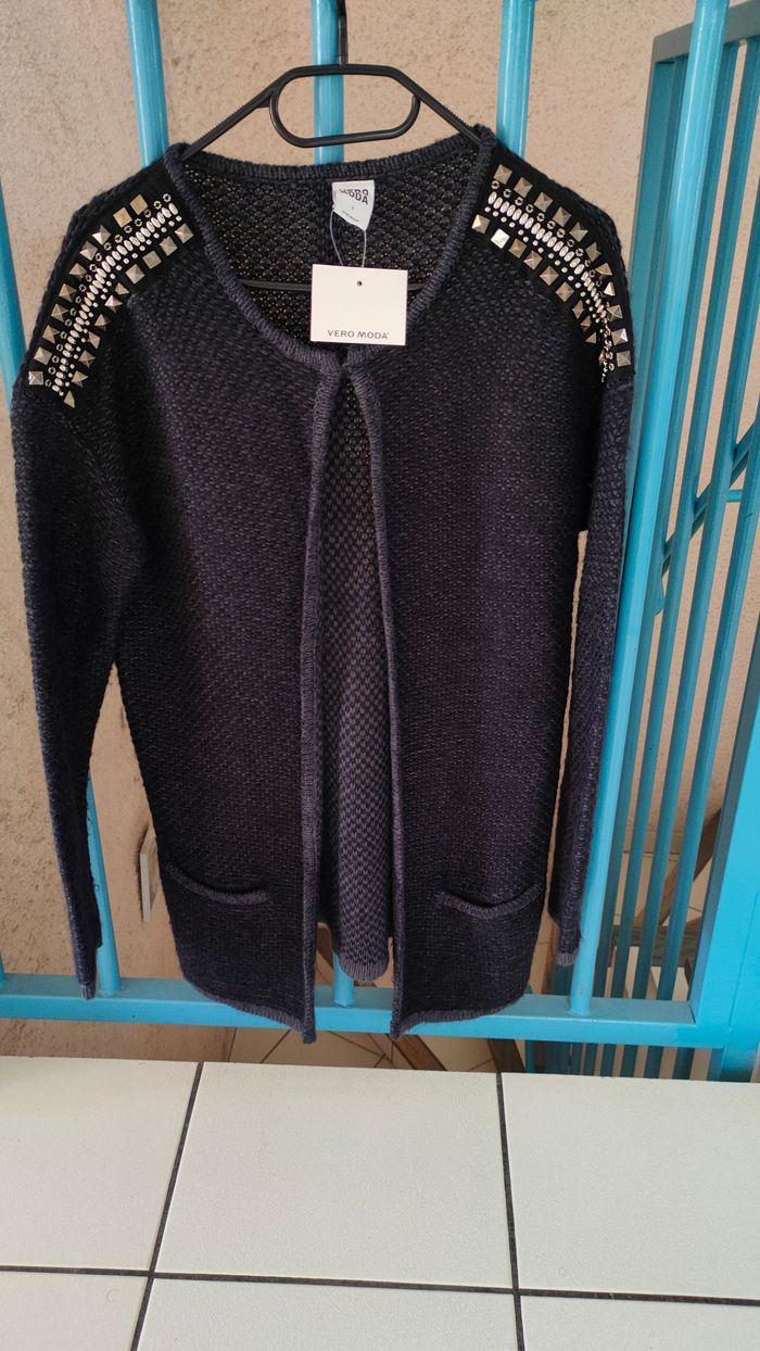 Gilet / cardigan long bleu foncé Vero Moda taille 36 NEUF avec étiquette strass aux épaules petit crochet pour fermeture sur le haut mesures à plat: longueur : 75cm, largeur dessous bras : 47cm