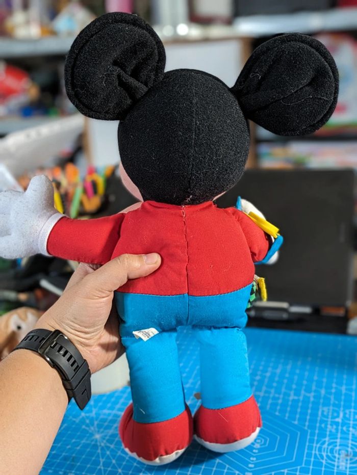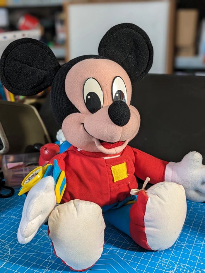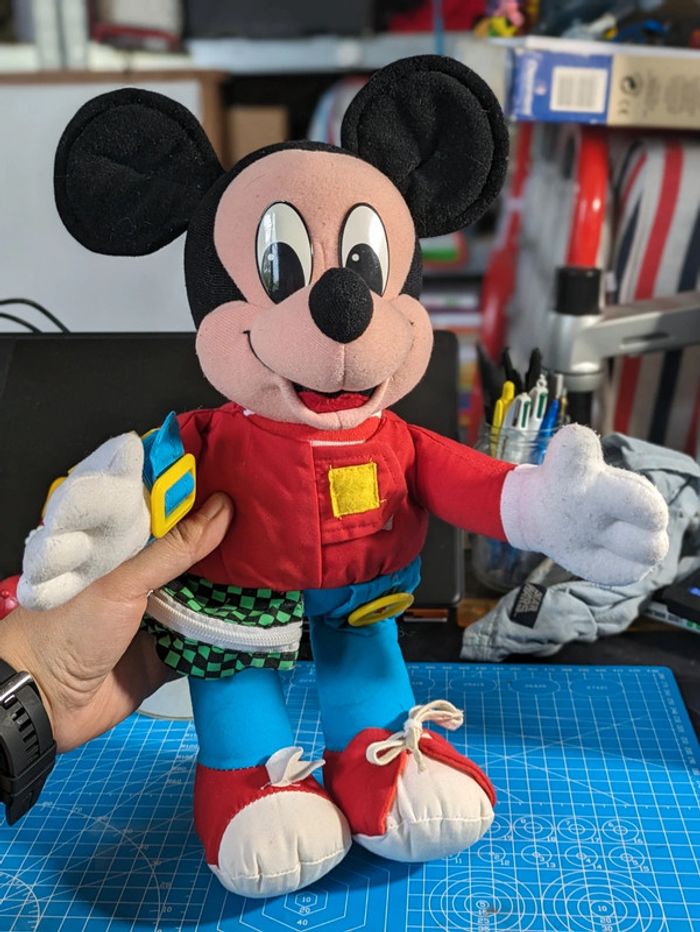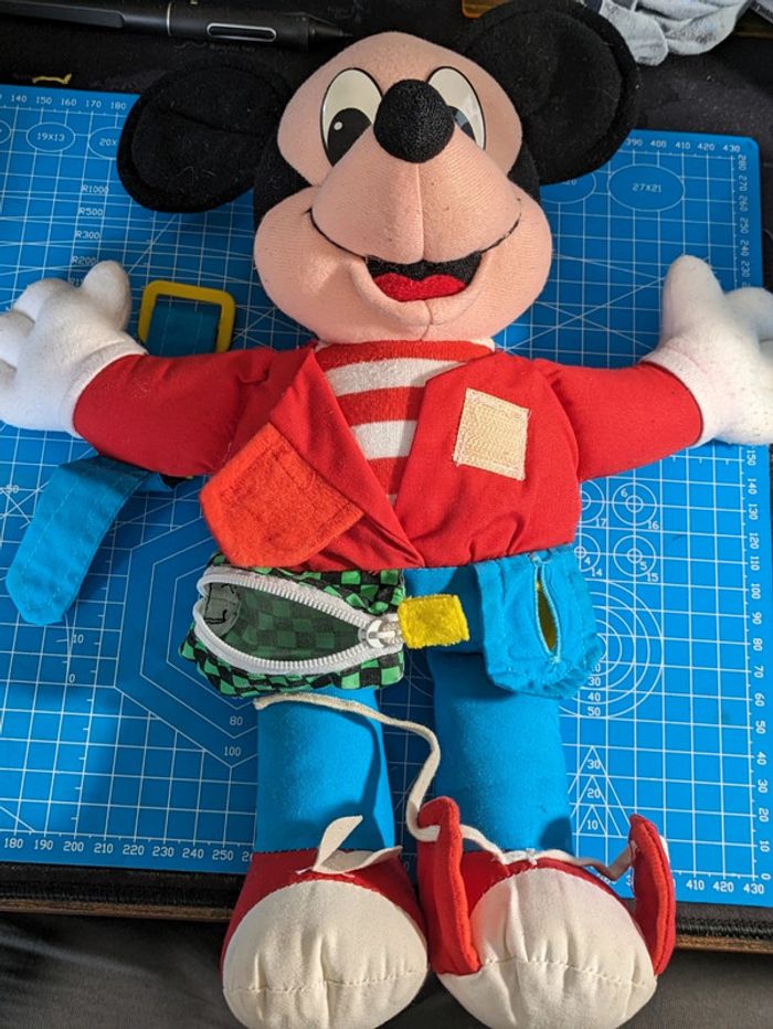 Peluche d'apprentissage Disney : Mickey Mouse par Mattel. Bouton, lacets, fermeture éclair, scratch et accrocher une montre. Très bel état pour son âge (1992)