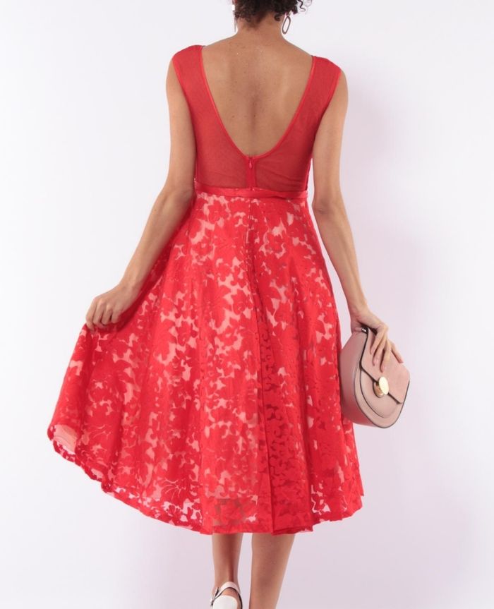 robe de soirée courte forme pin-up évasé dans le bas. dos nu. doublure beige avec tulle rouge transparente effet dentelle motif floral epaules et dos en tulle transparente rouge.  lien en tissu satiné à nouer à la taille coque en mousse au niveau de la poitrine  fermeture zippé au dos.  Taille 38 M Neuf