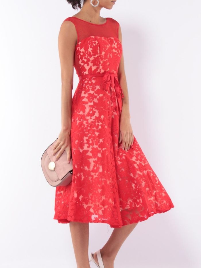 robe de soirée courte forme pin-up évasé dans le bas. dos nu. doublure beige avec tulle rouge transparente effet dentelle motif floral epaules et dos en tulle transparente rouge.  lien en tissu satiné à nouer à la taille coque en mousse au niveau de la poitrine  fermeture zippé au dos.  Taille 40 Neuf