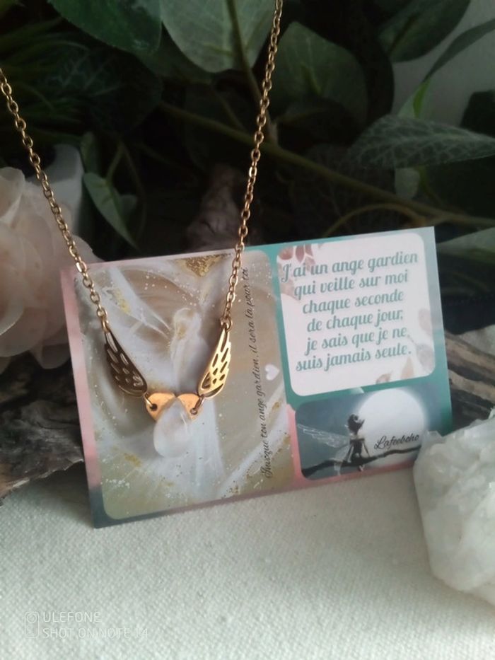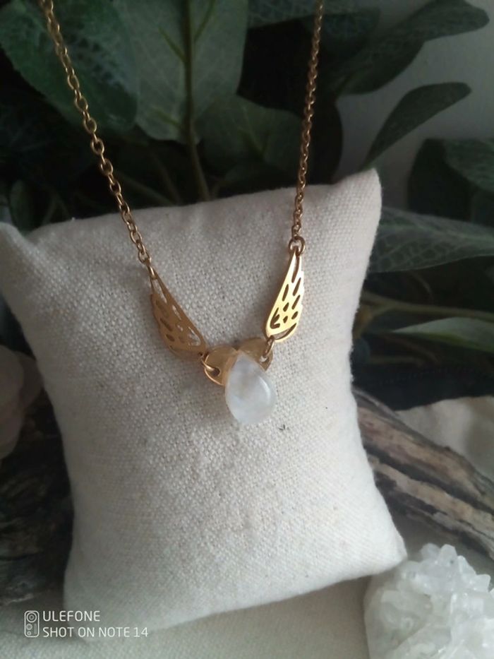 Collier ailes d'anges et pierre de lune à reflets bleutés naturelle + carte - photo numéro 1