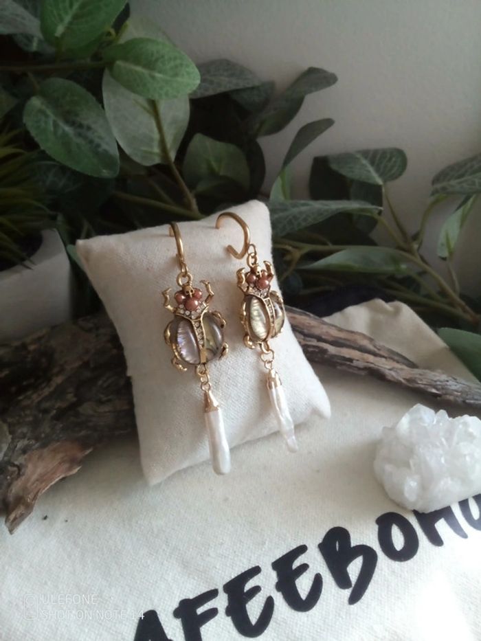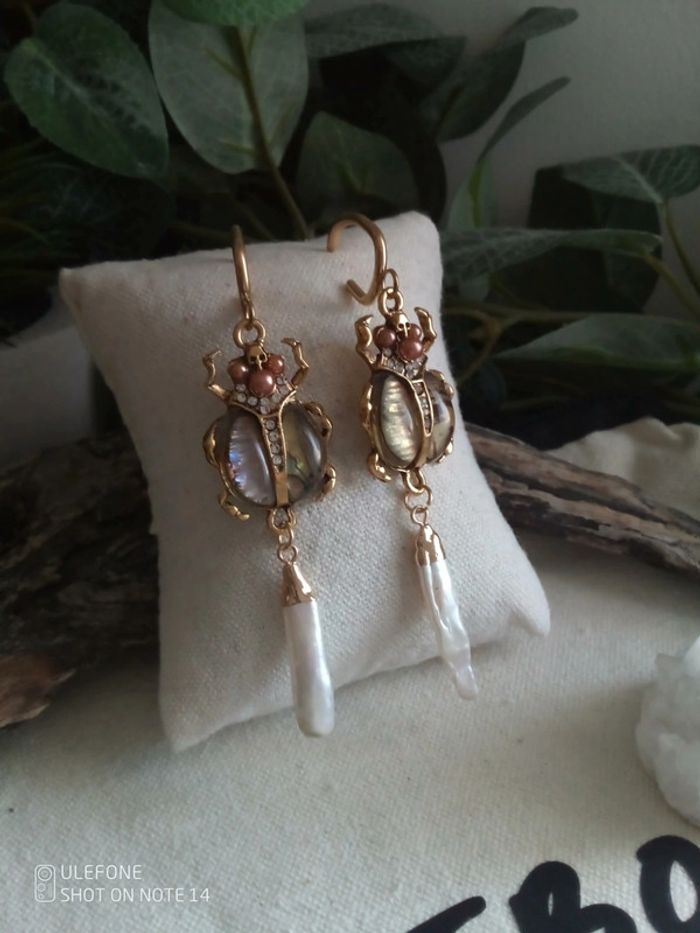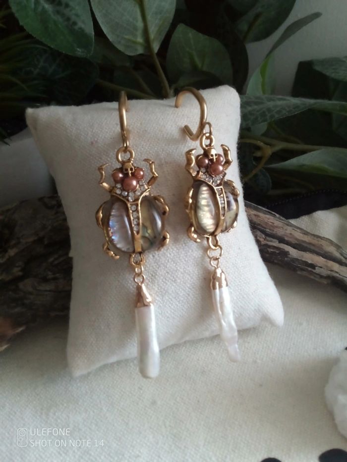 Boucles d'oreilles bohèmes scarabées abalone et perles de culture d'eau douce