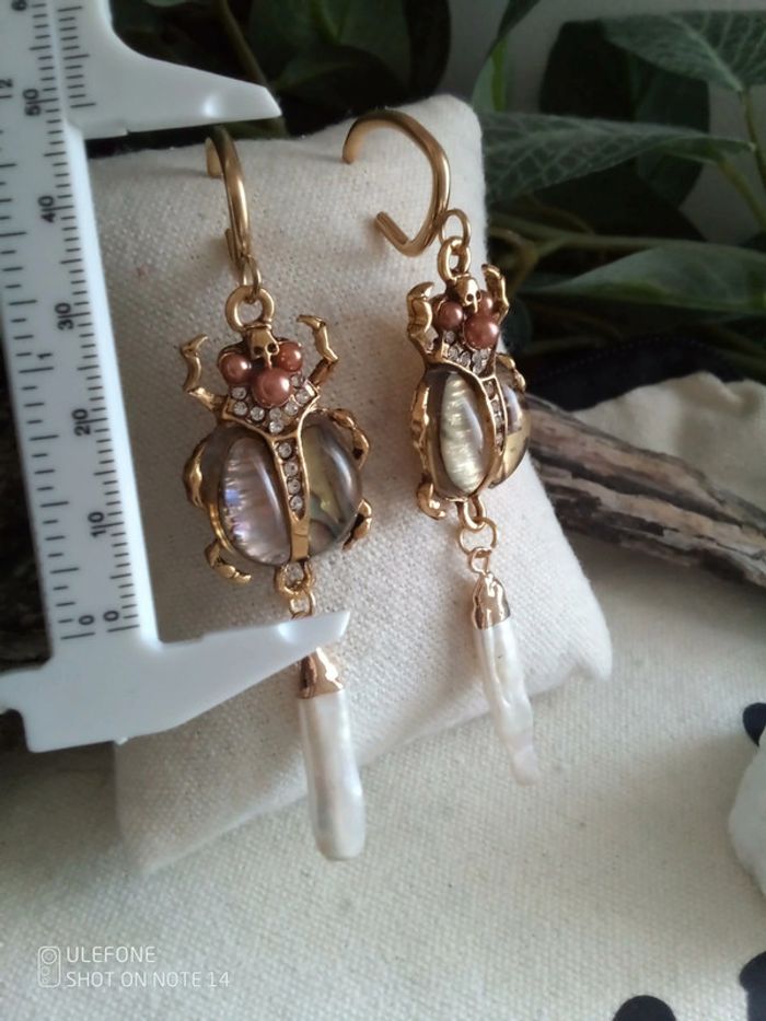 Boucles d'oreilles bohèmes scarabées abalone et perles de culture d'eau douce - photo numéro 1