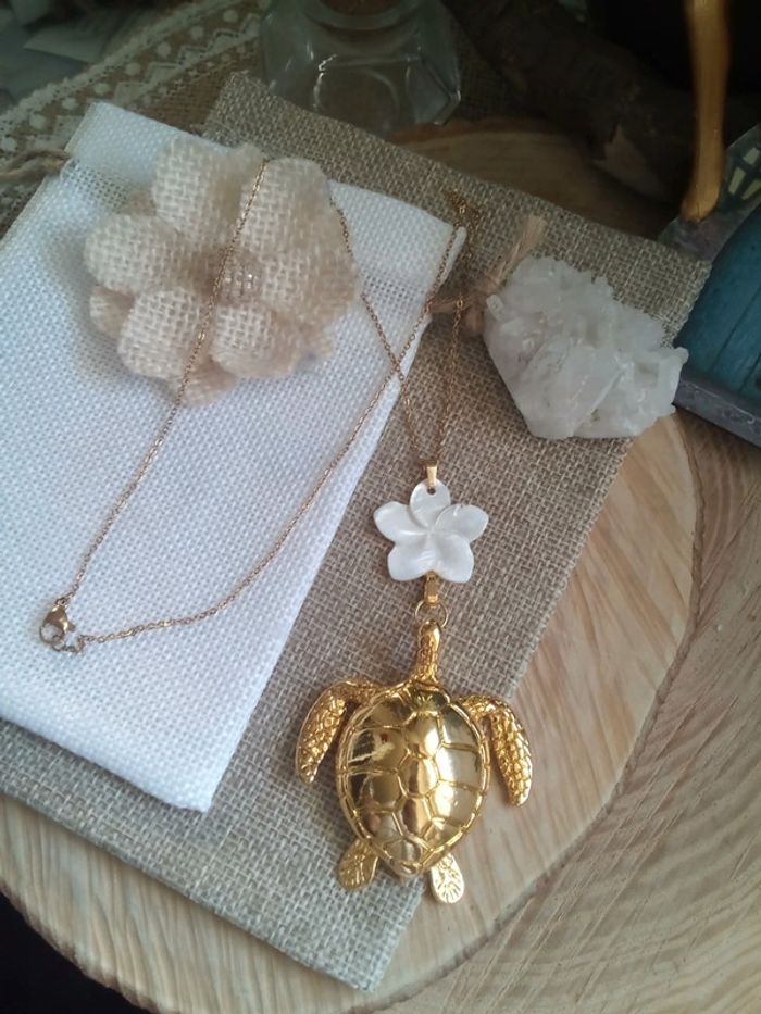 Collier tortue dorée et fleur de n'a'c'r'e naturelle