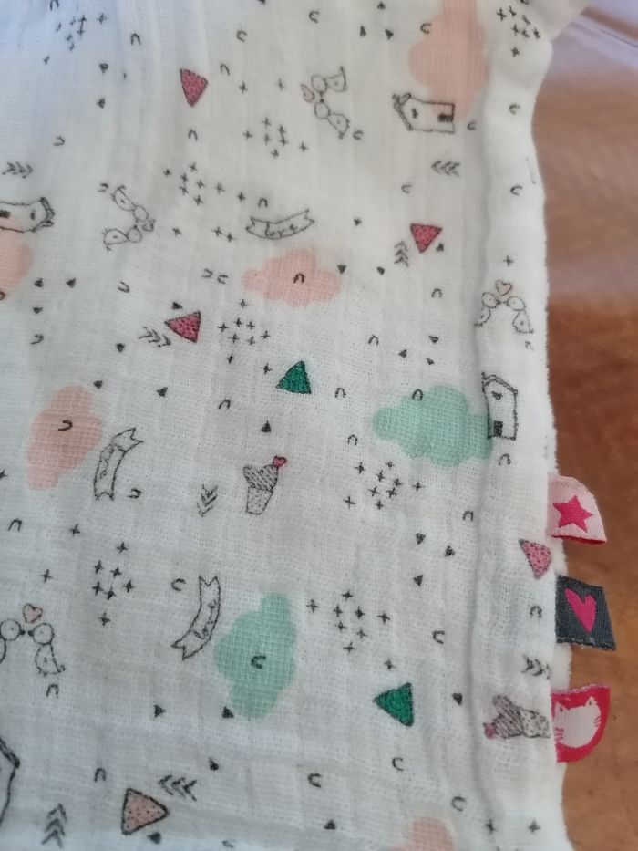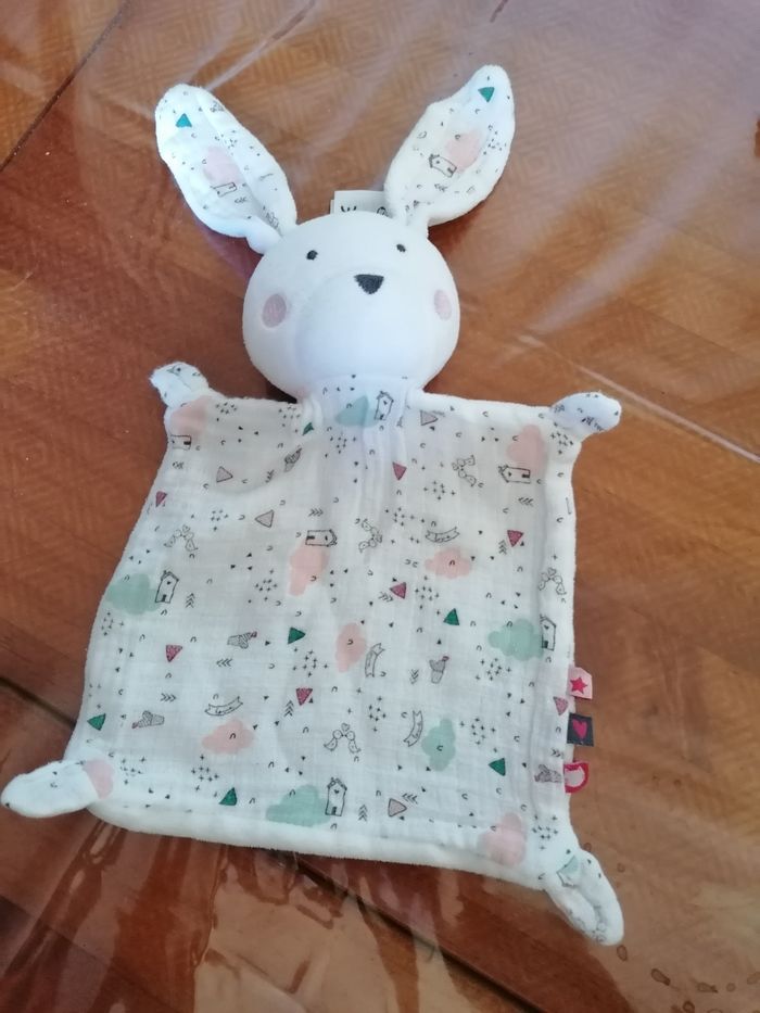 Doudou plat tête de lapin Tissus gaz coton Très bon état Imprimé Tape à l'œil plus l'étiquette