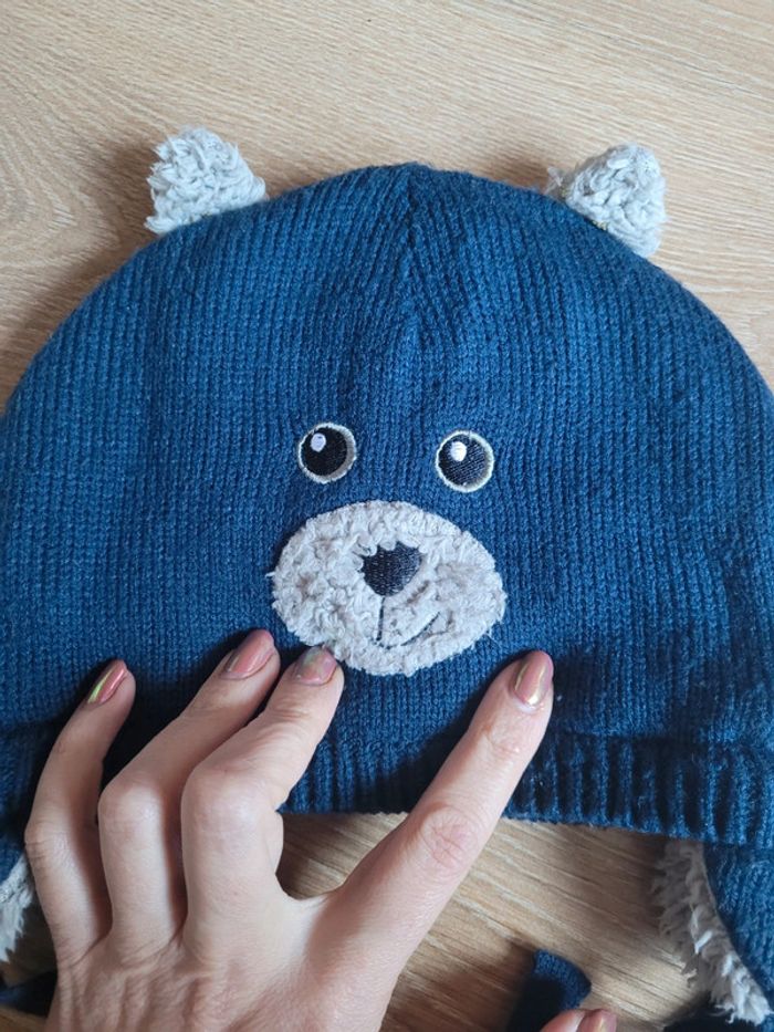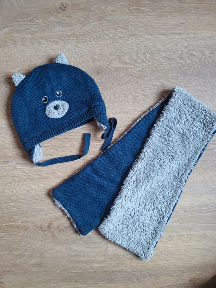 Ensemble bonnet et écharpe ours tricoté. Porté mais très bon état