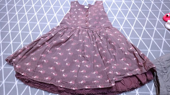 🦄1 robe couleur prune avec des fleurs, Boutonnée au niveau du torse, doublure légère. Longueur depuis le dessus de l'épaule : 56cm environ. Notée 36 mois, Très bon état, Kimbaloo 🦄1 robe boule à bretelles, avec petite doublure. Grises à motifs chevrons très fins. 2 longueurs possibles pour les bretelles. Longueur depuis le dessus de l'épaule : 53cm environ. Très bon état, kid kanaï 🦄1 jupe grise en velours assez fin avec volants. possibilité de mettre une ceinture. Longueur de la jupe : 26cm environ. Très bon état. kid kanaï 🦄1 jupe rose fleurie à volants. Longueur : 22cm environ. Très bon état général, Entre nous les filles. 🦄1 jupe grise à volants, taille réglable à l'intérieur. Longueur : 22cm environ. Très bon état, NKY #frip_fille3ans