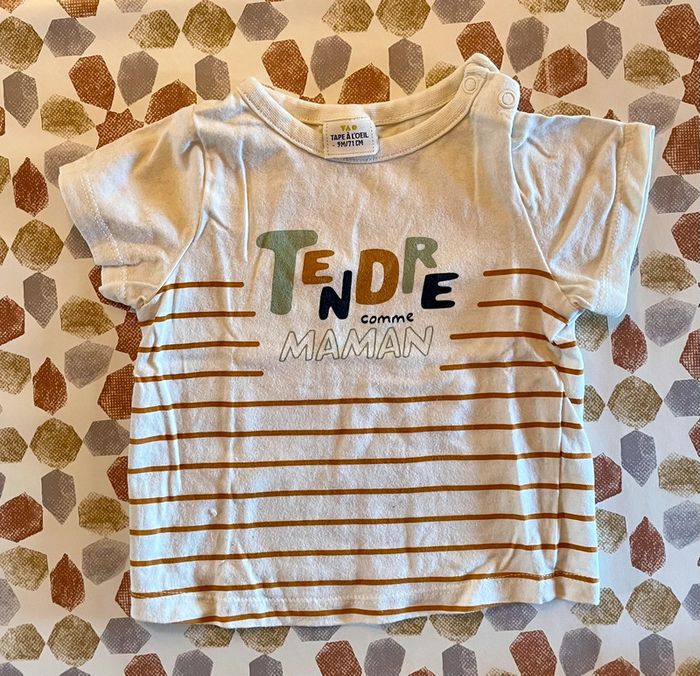 T-shirt à manches courtes 9mois, en parfait état. Marque Tape à l’Oeil. N’hésitez pas à jeter un œil à mon dressing, des prix de lots sont appliqués 😊