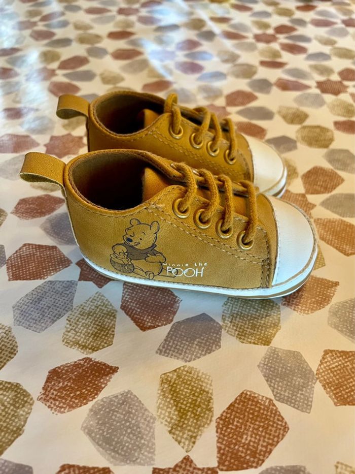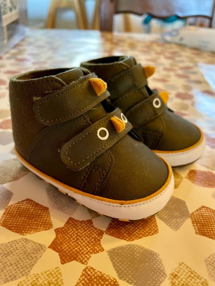 Lot de 2 paires de chaussures 6/9 mois jamais portées. Une paire couleur camel « Winnie l’ourson »avec des lacets (marque Disney) et une paire kaki dinosaure (marque Orchestra). N’hésitez pas à jeter un œil à mon dressing, des prix de lots sont appliqués 😊
