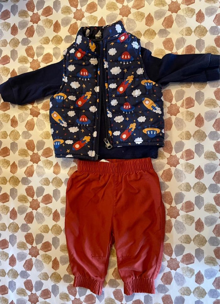 Ensemble 3 mois comprenant un pantalon, un pull et une veste sans manches, porté une ou deux fois. En très bon état. Sans marque. N’hésitez pas à jeter un œil à mon dressing, des prix de lots sont appliqués 😊