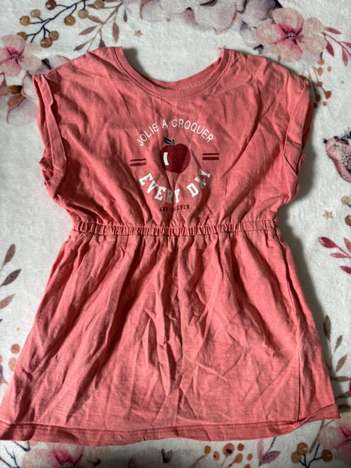 Adorable robe rose avec l’inscription Jolie à croquer Every Day et un petit dessin de pomme 🍏. Parfaite pour les beaux jours ! ☀️💕 Taille 3 ans (90/97 cm), marque Kiabi.