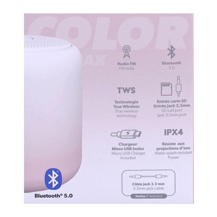 Avec sa technologie Bluetooth 5.0, vous profiterez d'une autonomie de 8h et d'une restitution sonore plus fidèle. De plus, grâce à la technologie TWS, vous pouvez connecter deux des enceintes entres elles pour que votre musique soit présente partout, et pour augmenter la puissance sonore. L'enceinte COLOR est également dotée d'une fonction MP3 pour diffuser de la musique via son lecteur de carte micro SD (jusqu'à 32 Go) et d'un haut-parleur 3 Watts RMS pour booster le son de votre playlist et mettre de l'ambiance autour de vous. Contrôler votre musique grâce aux boutons de contrôle du volume / changement des pistes / marche arrêt. Radio FM Bluetooth 5.0 Technologie True Wireless Entrée carte SD Entrée jack 3,5 mm Chargeur micro USB inclus IPX4 Câble jack 3,5 mm inclus