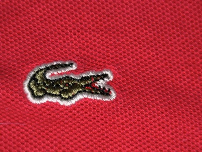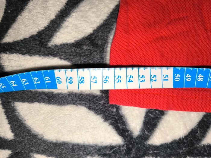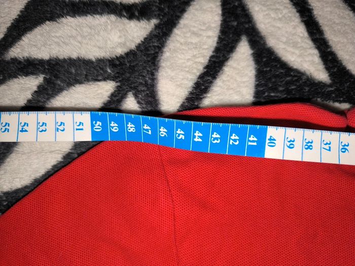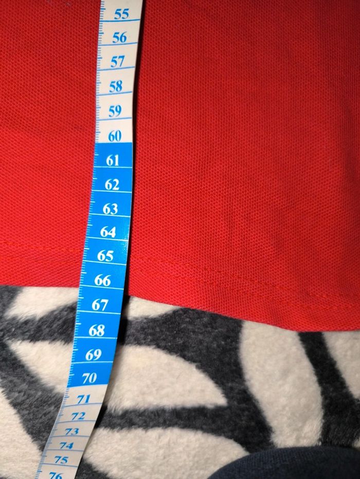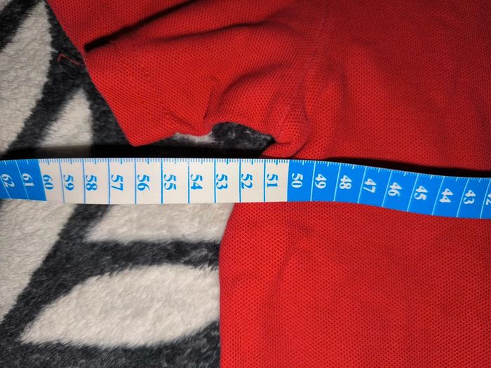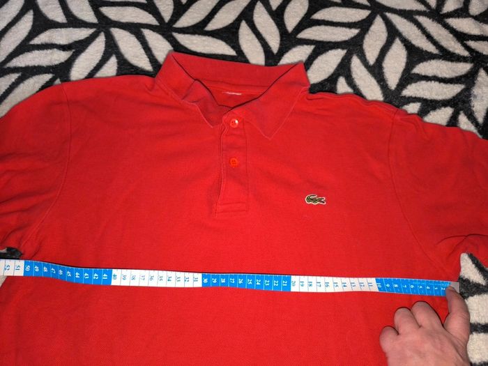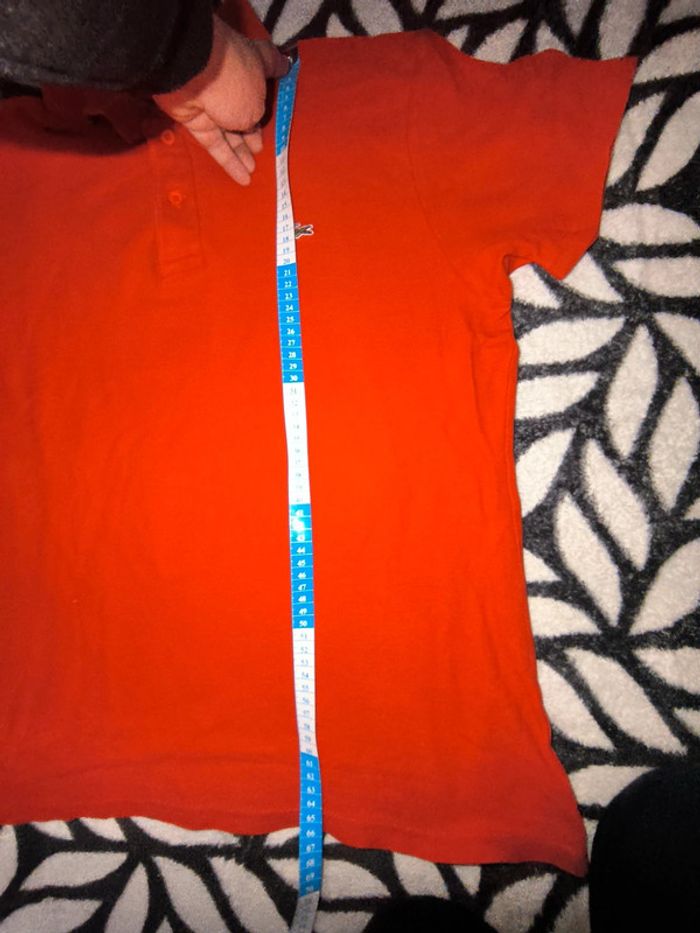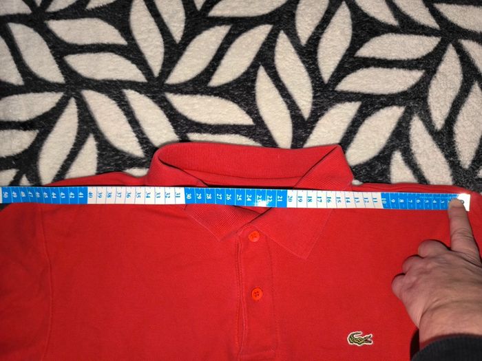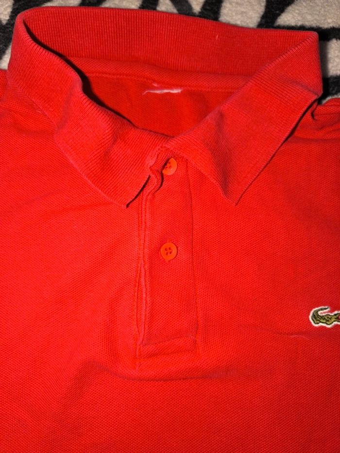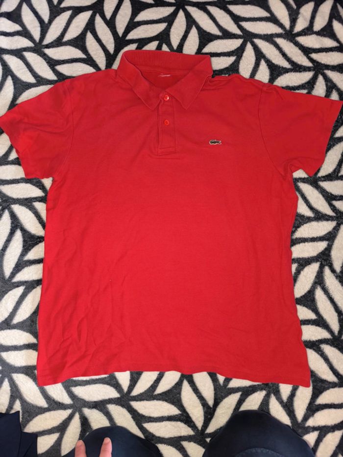 Polo Lacoste rouge en bon état, l'étiquette de taille n'est plus présente je dirai taille 40, voir mesures en photos.