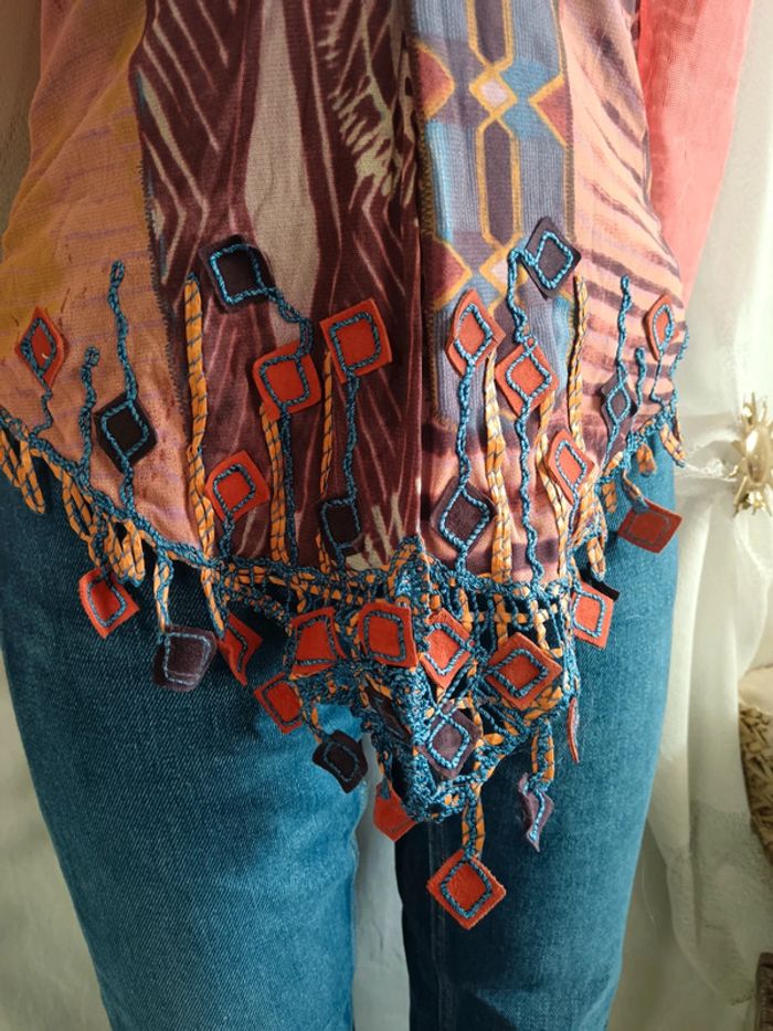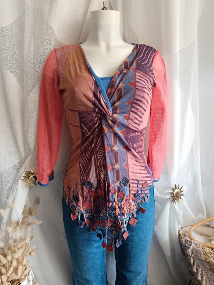 haut en mesh des années 2000 Save The Queen Taille L Mesh donc stretch et près du corps. Empiècement croisé au décolleté puis ouvert en bas, débardeur intégré en mesh et manche resille. Des petites franges à bouts carrés en cuir #calm38 #calm40 #hautmesh #hautsavethequeen #avantgarde #futuriste #boho