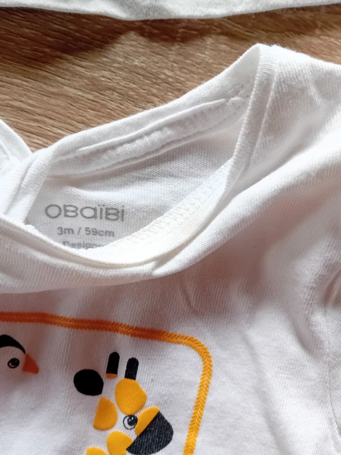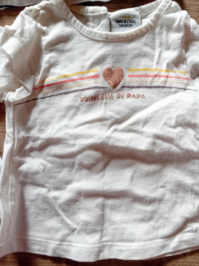 2manches longues : vertbaudet, mot denfant 2 manches courtes: obaidi, tape a loeil Taille 3mois Attention celui avec la girafe est un petitpeu jauni à un endroit de l'encolure et il manque des paillettes sur le cœur du princesse de papa