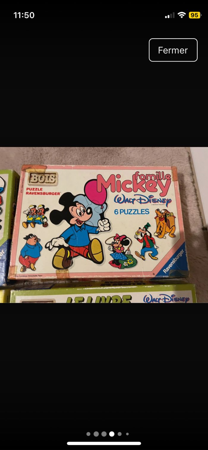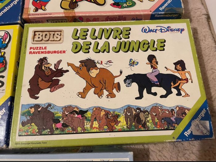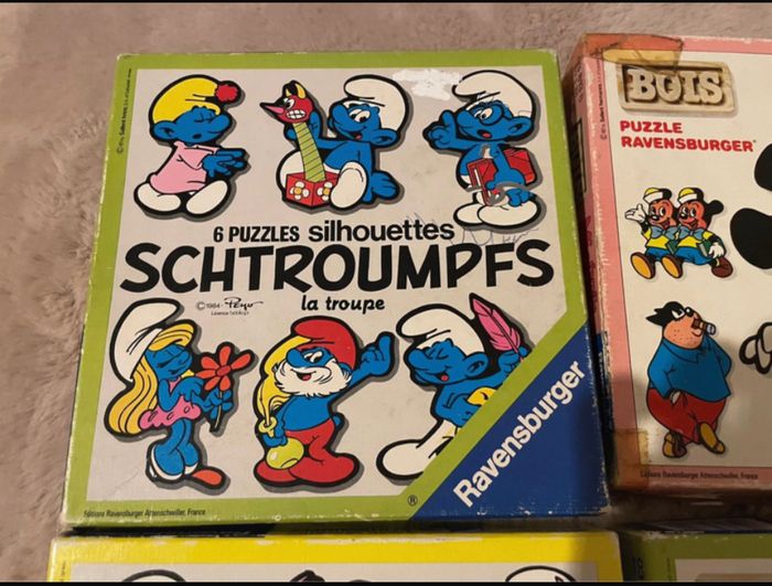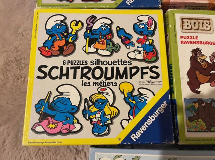 4 puzzles ravensburger, vintage: - puzzle silhouettes schtroumpfs « la troupe « , 1984, complet, traces d’usure et stylo sur la boîte, 1 pièce à recoller. 8 euros - puzzle 6 silhouettes schtroumpfs « les métiers » 1983, quelques traces d’usure sur la boîte, 8 euros. - puzzle en bois Walt Disney, le livre de la jungle, très bon état, quelques traces d’usure sur la boîte. 10 euros - puzzle en bois 6 silhouettes famille Mickey Walt Disney, traces d’usure, boîte scotchée, complet, 1982, 8 euros. Le lot : 30 euros
