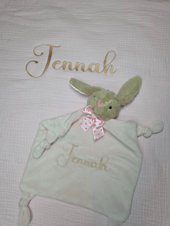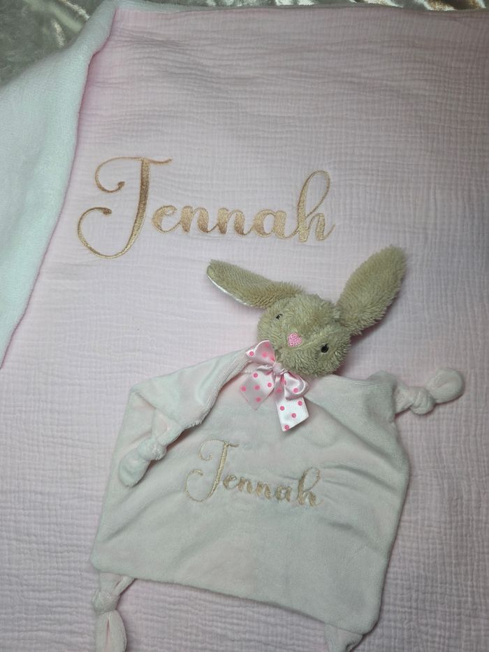 Couverture bébé en gaze de coton avec doudou lapin rose Prénom broder Couleur et écriture à choisir