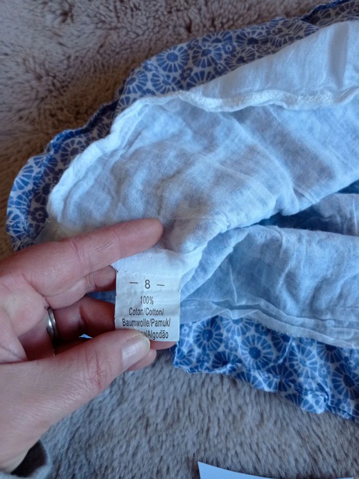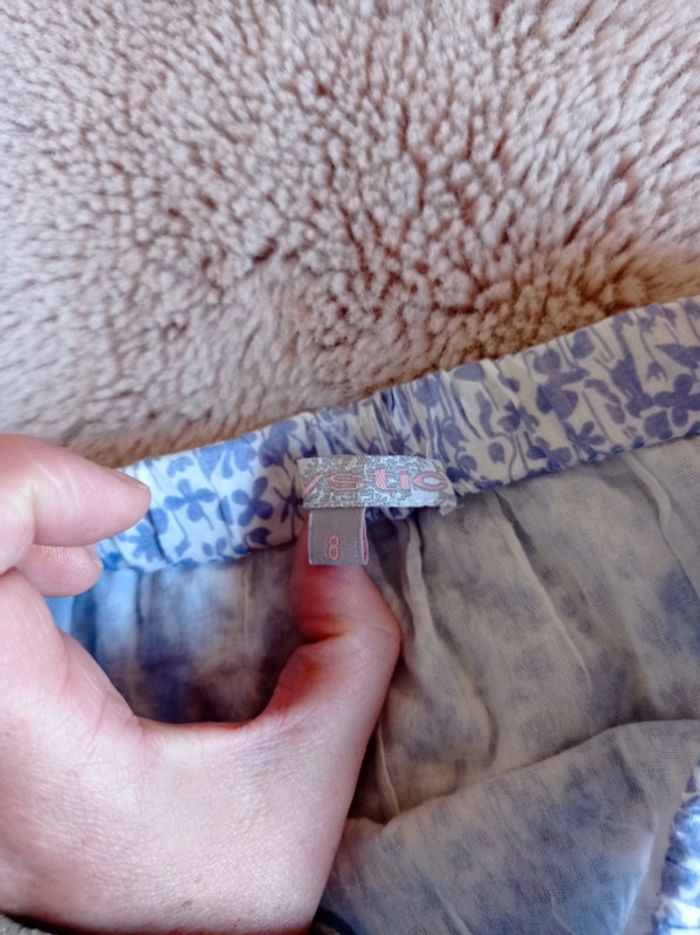 Jupe légère de la marque Mystic en taille 8 ans. Motif fleuri bleu sur fond blanc. Doublée. 100% coton. Fil de couture qui ressort (voir photo), mais ça ne se voit pas. Pour voir toutes mes annonces en 8 ans afin de constituer un lot et bénéficier de réductions : #nanoukou_fille_8ans Retrouvez tous mes autres liens dans mon profil avec toutes mes tailles disponibles, jouets, chaussures... Merci de me contacter avant tout achat via UPS et Vinted Go.