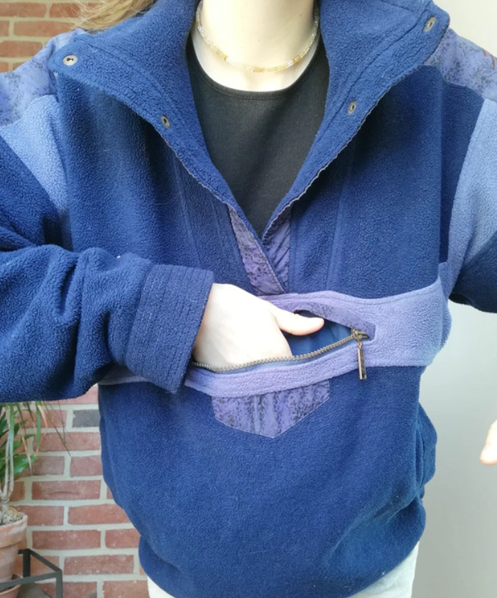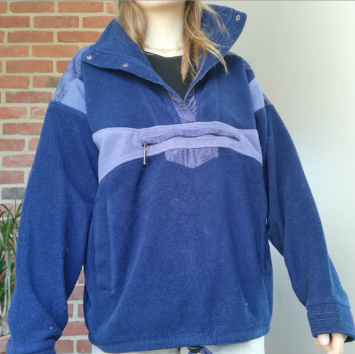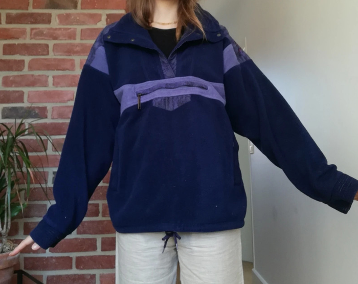 Bonjour, Je vends une polaire Polartec 100% vintage qui était à ma mère. Bleu marine et bi matière avec le tissu type kway sur les épaules. Pressions sur le col, fil pour resserrer la taille, et grande poche et poche kangourou. Petite couture à refaire sur l'une des poches. Je peux vous le faire pour la vente si vous le souhaitez. On peut en discuter par message privé. Sinon très bon état et super chaud ! Taille 46, pour moi qui fait du M, ça donne comme ça sur les photos, style rétro vintage et se porte loose/ large