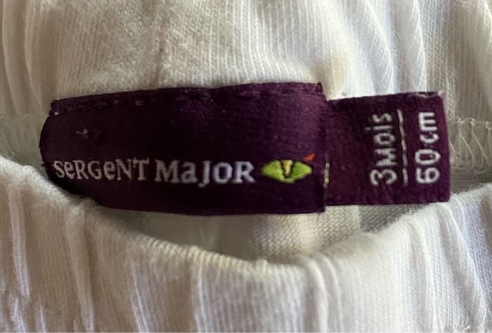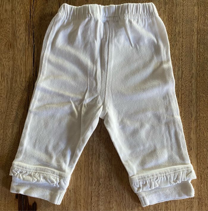 Pantalon blanc. sans taches Avec un petit dessin sur la jambe gauche et des petits froufrous en bas des gens.