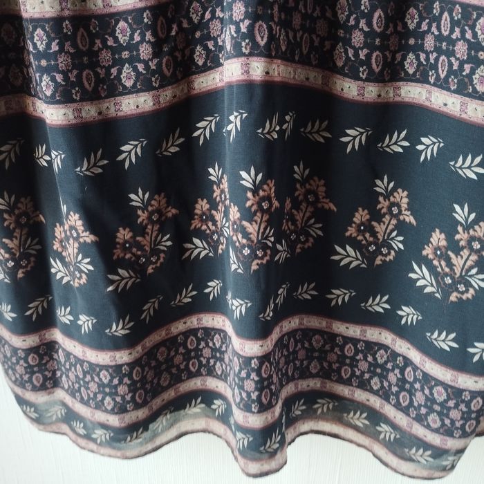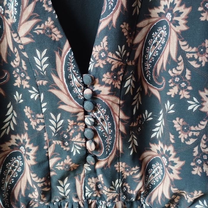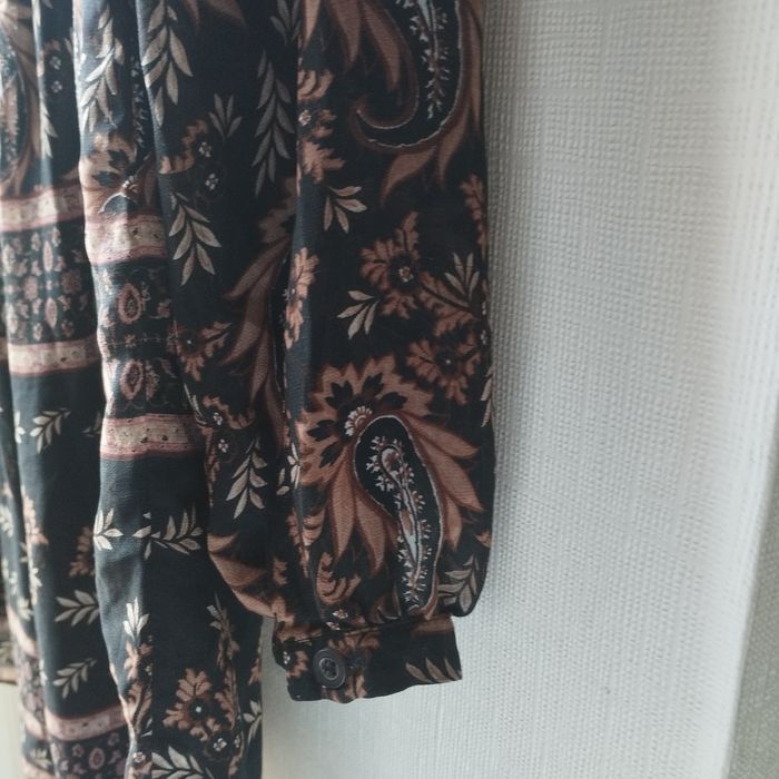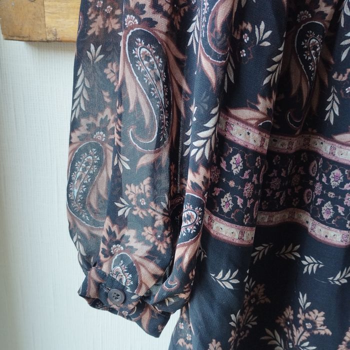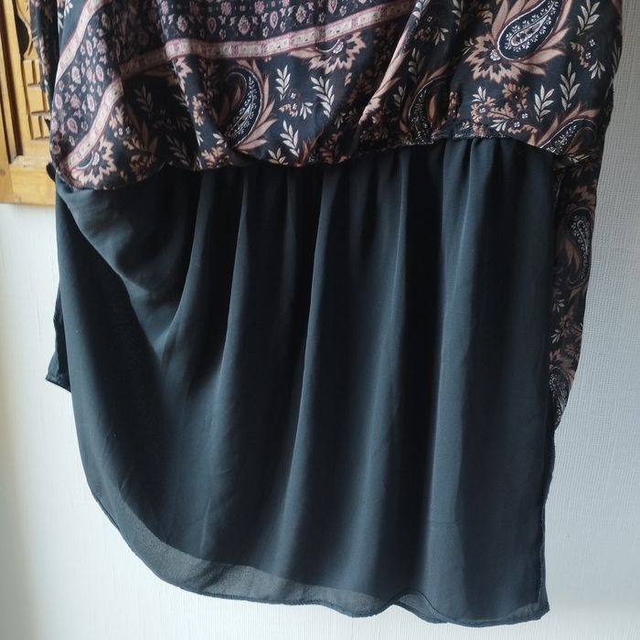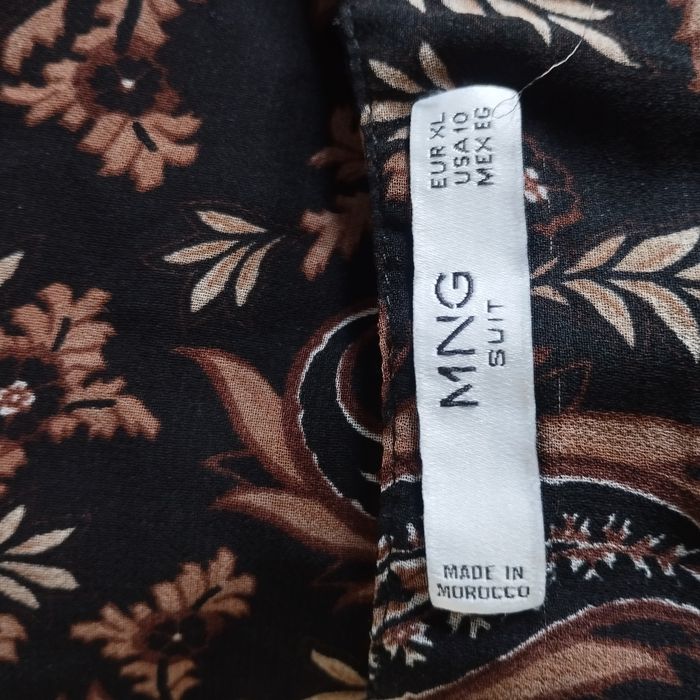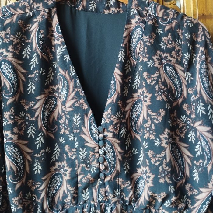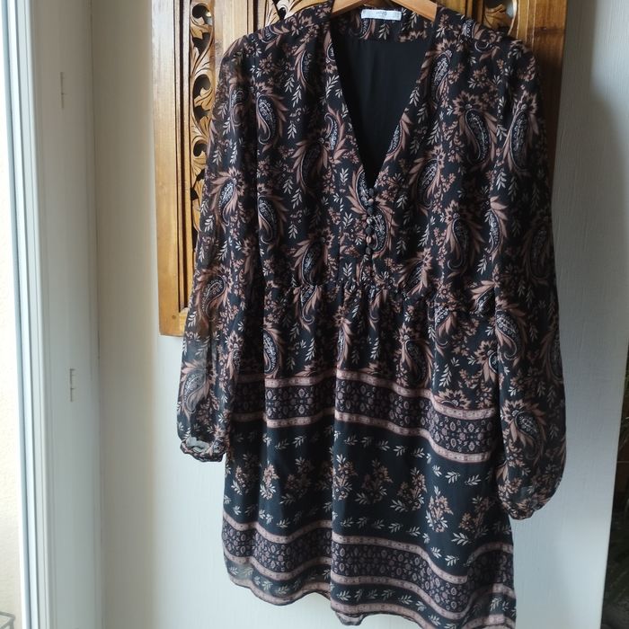 Robe taille XL de chez Mango, longue manches voile transparence, bas de la manche cintrée par un bouton, taille froncée. Col V avec boutons, très belle doublure Noire, sauf les manches. Aisselle à Aisselle 53cm.