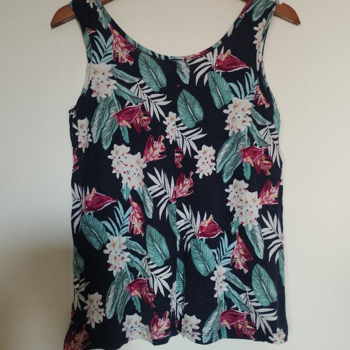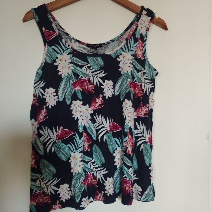 Haut pour femme sans manche de chez Esmara. Motifs fleurs sur fond bleu marine. Aisselle à Aisselle 44cm. Hauteur 59cm.