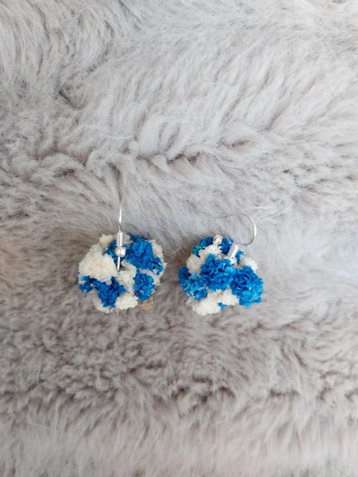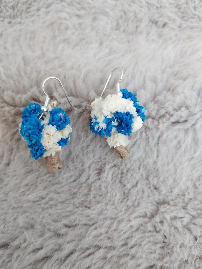 Boucles d'oreilles mini bouquet de fleurs séchées bleues et blanche