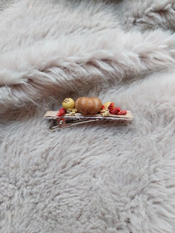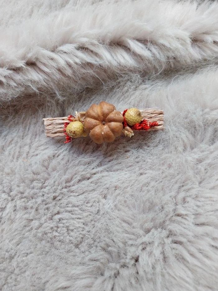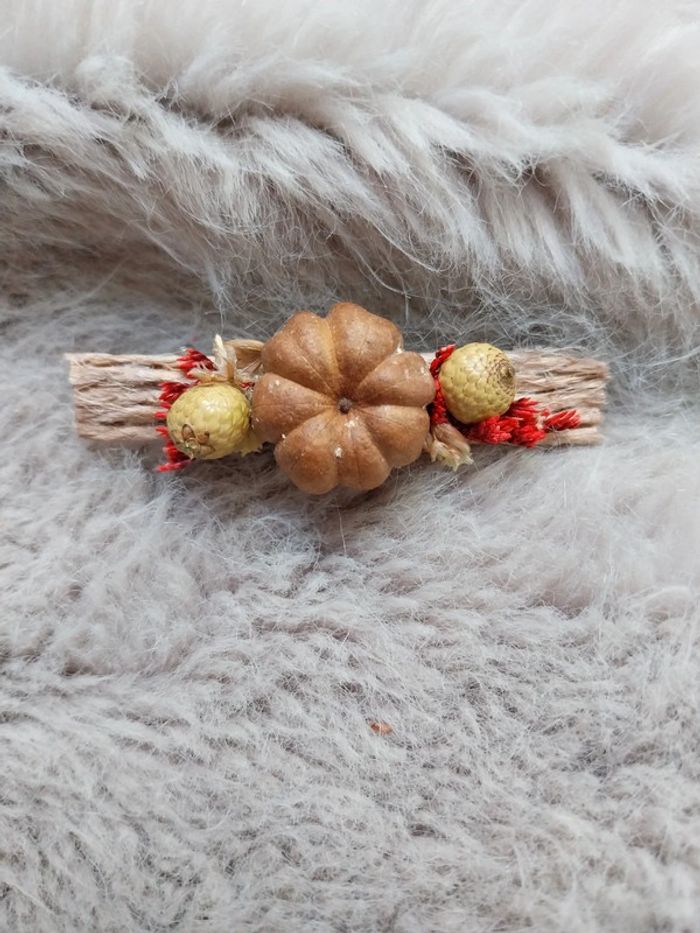 Accessoire cheveux de 6cm orné de fleurs séchées avec une véritable mini citrouille séchée