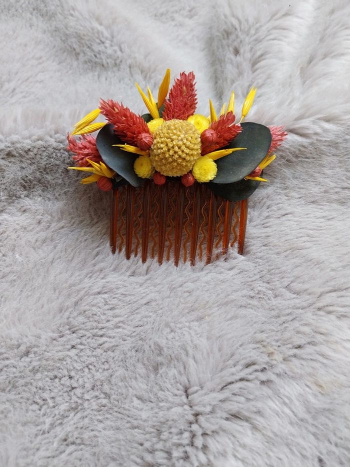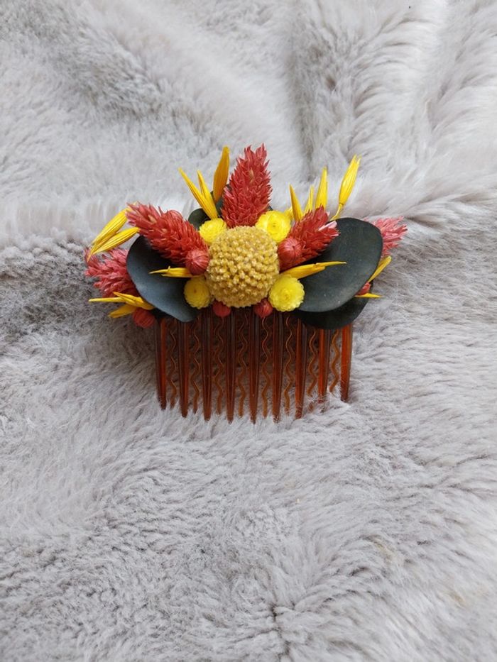 Peigne de fleurs séchées jaune et terracotta, idéal pour accessoires de coiffure, tresses, torsades ou chignons