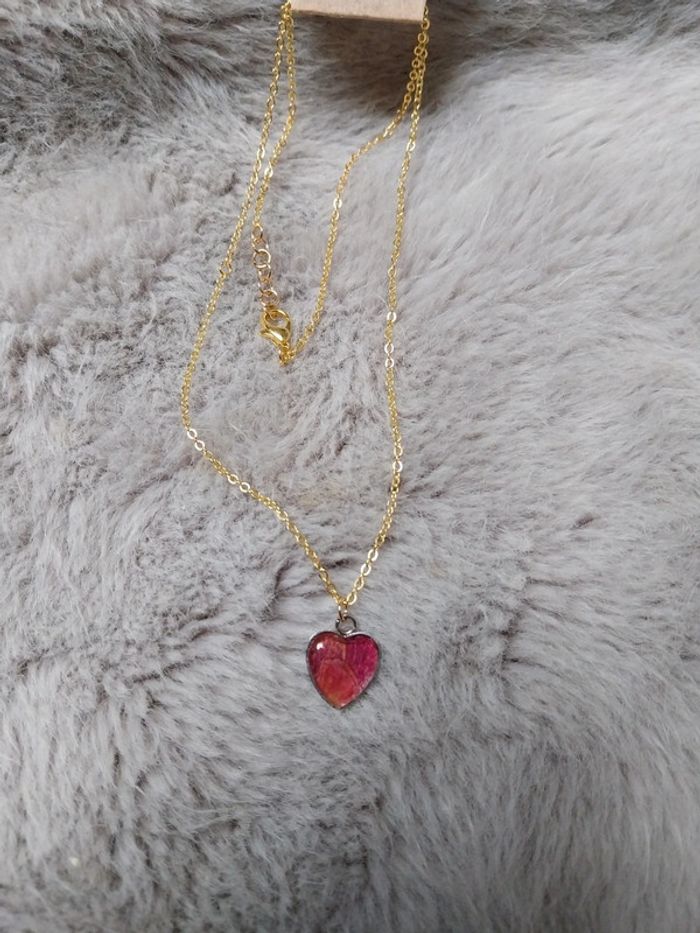 Collier avec un cœur, fleurs séchées sous verre sur une chaîne en acier inoxydable