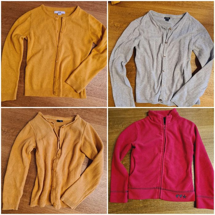 Lot 4 gilet Le gris en parfait état Le jaune en haut à gauche à des bouloches Le jaune en bas à été bcp porté mais en bonne état ni taché ni trou Et le polaire la fermeture est coincé au milieu donc s'enfile comme un pull