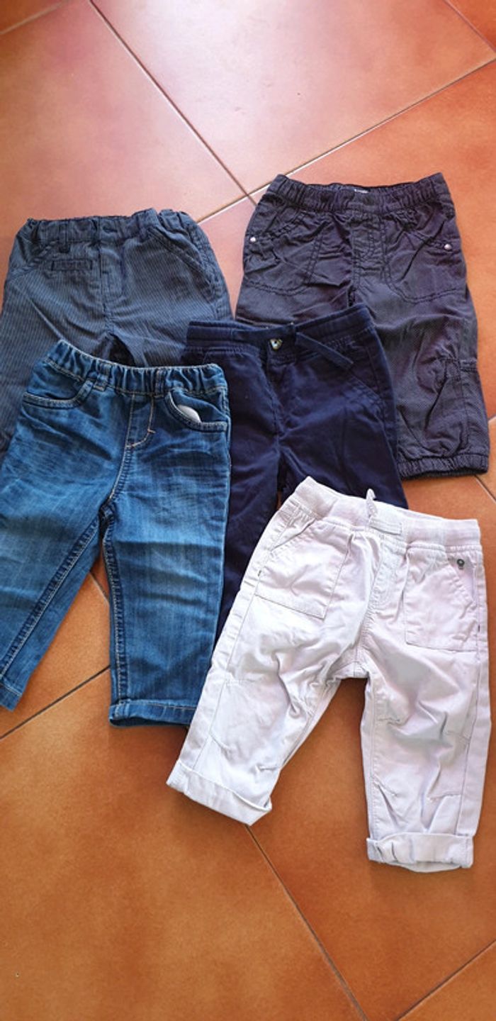 Lot de 5 pantalon et jean En excellent état Taille 12 mois Marque : kiabi , obaibi, orchestra...
