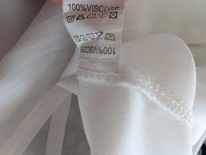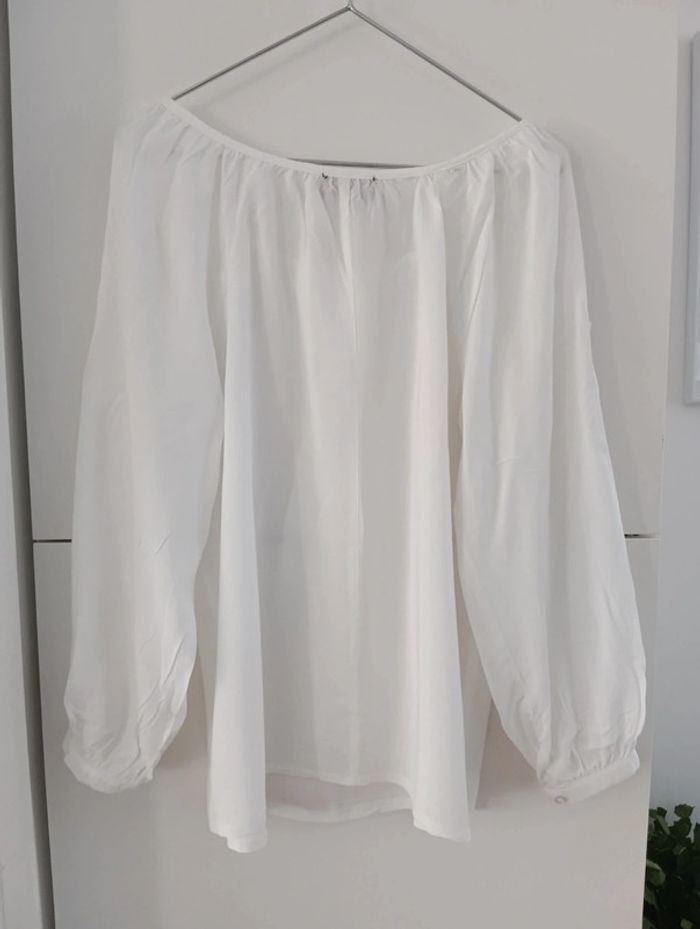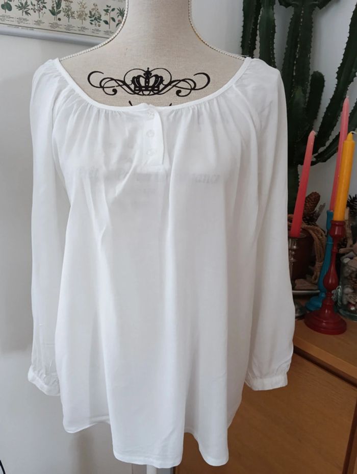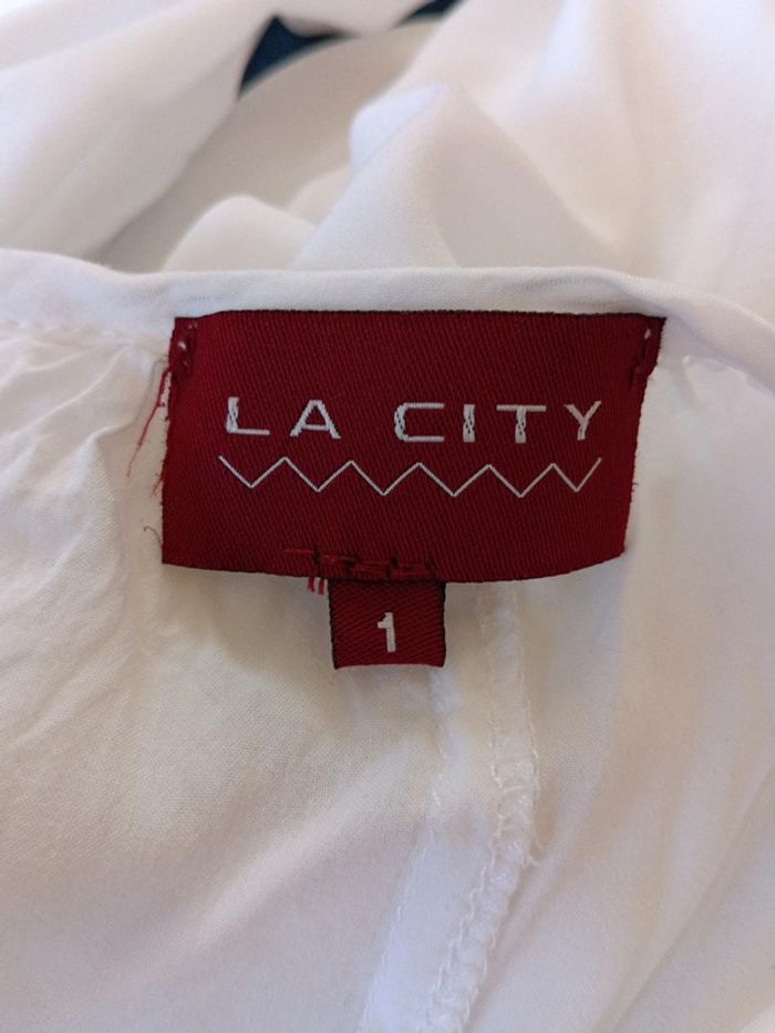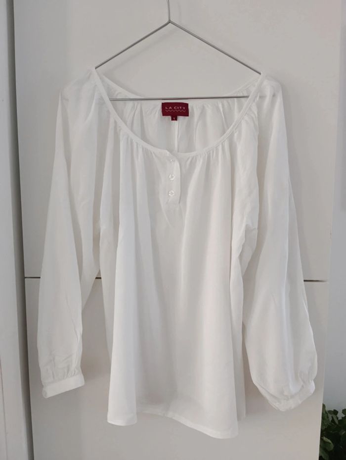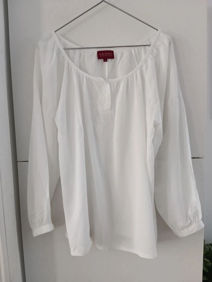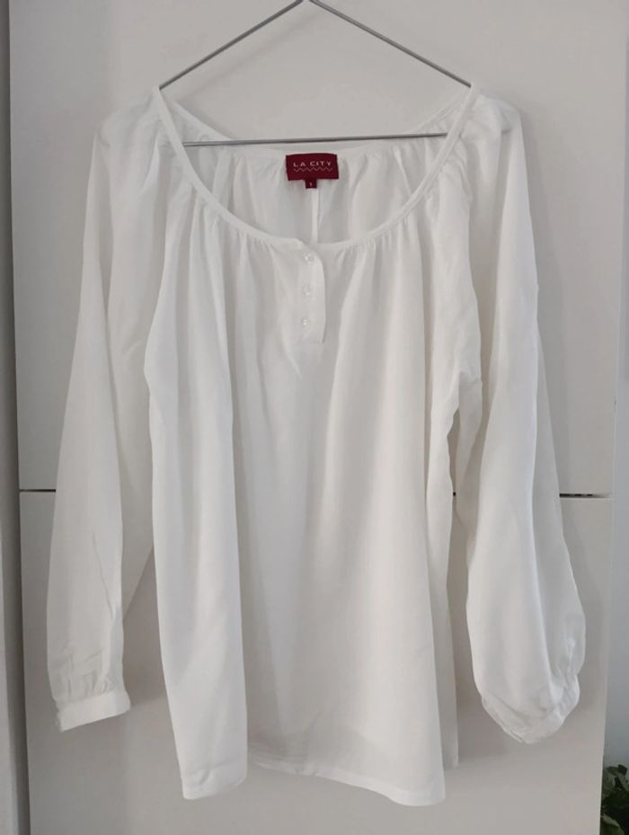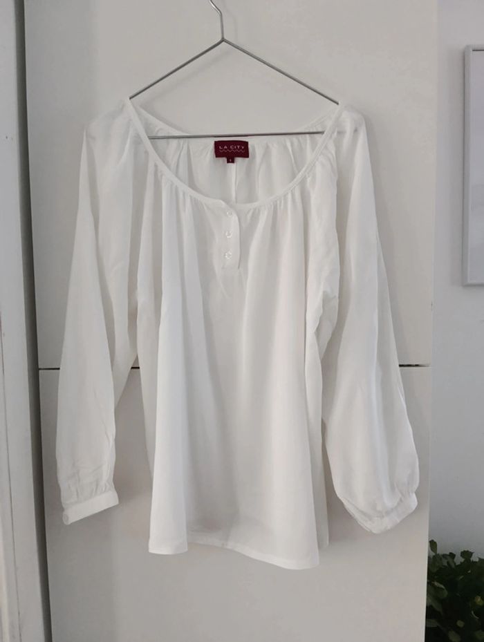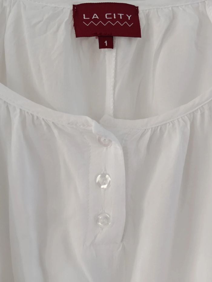 Blouse blanche légère fluide La City, Taille 1 Transparente, En viscose, Très agréable à porter. Possibilité d'attacher les manches pour les raccourcir. Taille 38 estimée à confirmer avec les mesures et selon l'effet souhaité. Mesures Aisselles 50cm Longueur 66cm