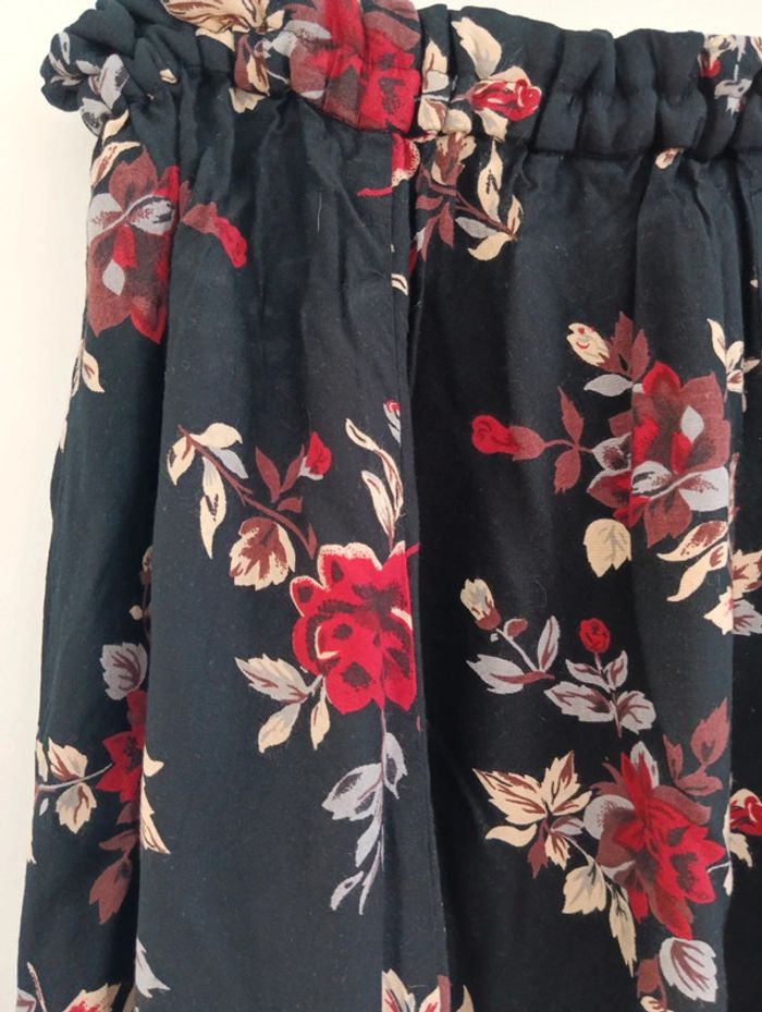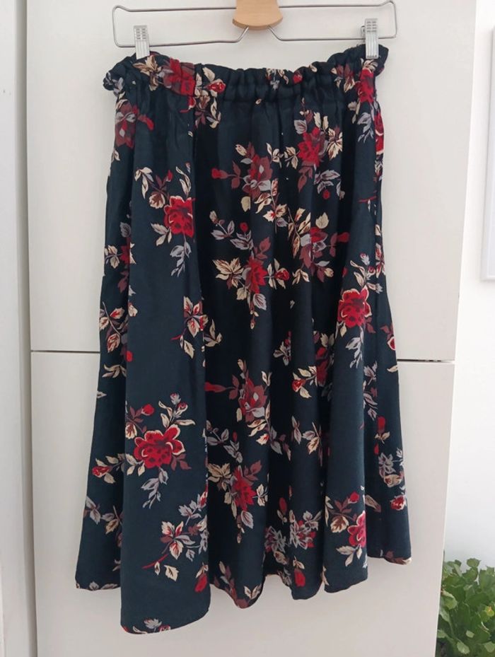 Jupe viscose noire à fleurs rouge Taille élastique froncée longueur midi Peut convenir à plusieurs tailles Taille extensible de 36 à 52cm Longueur 70cm