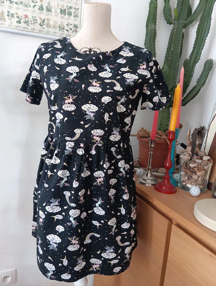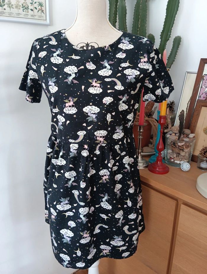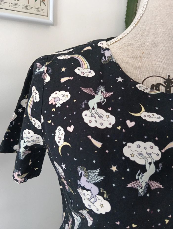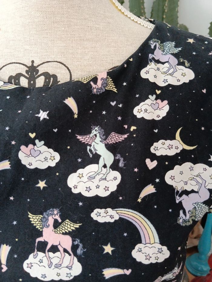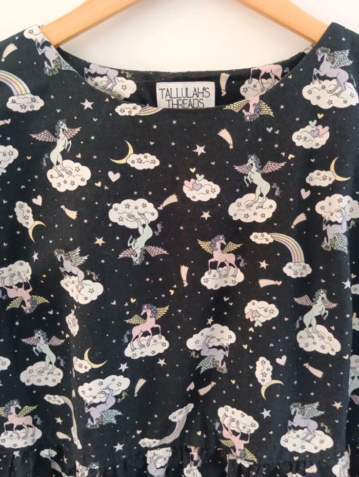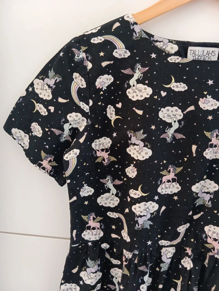 Mini robe imprimé Licorne Tallulah's threads Fond noir imprimé multicolore. Made in England Taille 36 estimée à confirmer avec les mesures selon l'effet souhaité. Mesures Epaules 40cm Aisselles 49cm Taille 44cm Longueur 81cm