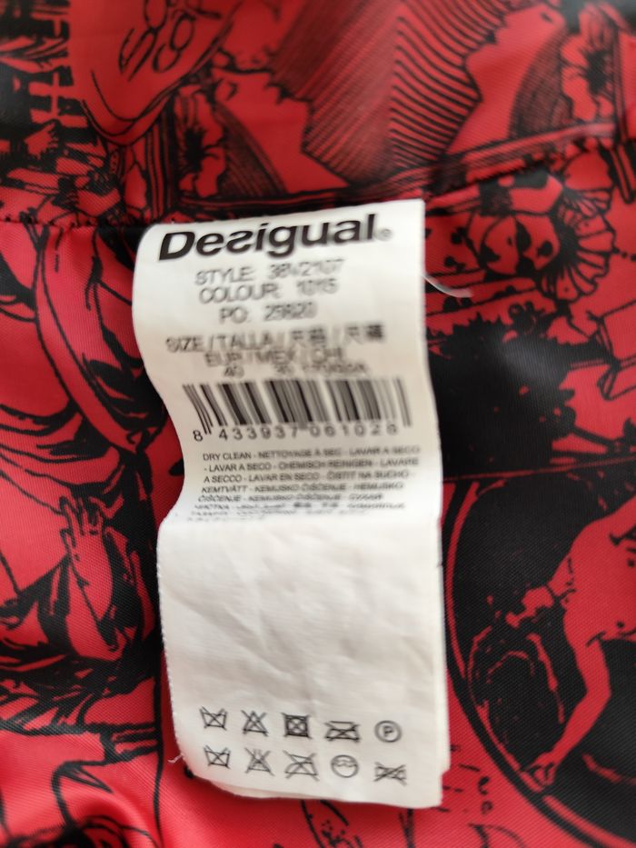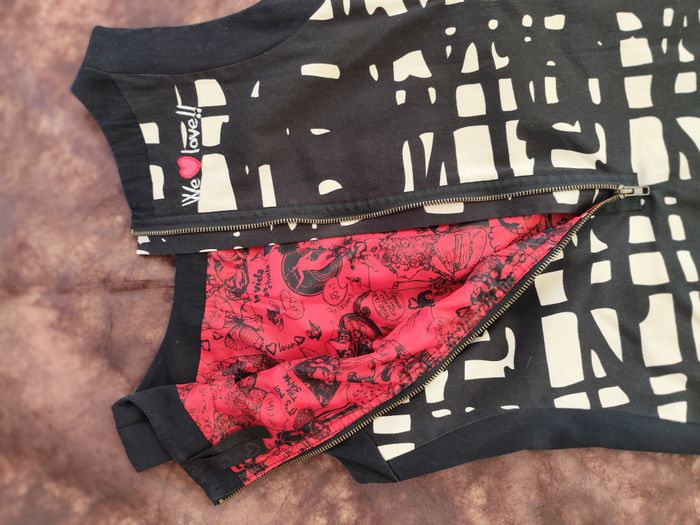 Robe Desigual fonds noir à motifs blanc "We Love It". Zippée dans le dos. Doublure rouge. Taille 38/40. Tour de poitrine 92cm. Hauteur 81 cm. Très peu portée. Excellent état